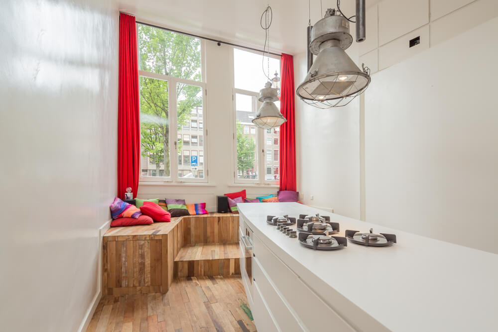 This former shop in a monumental canal house is renovated and refurnished to an open and very distinctive loft. The challenge of the design was on one hand to make a very recognizable and functional new layout in a somewhat chaotic space with different heights, corners and edges. The client loves to cook and wanted a unique kitchen where he could have as much contact as possible with his guests during cooking.