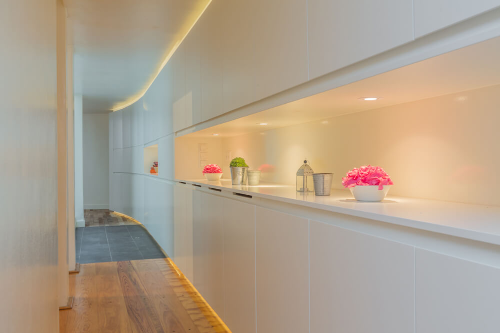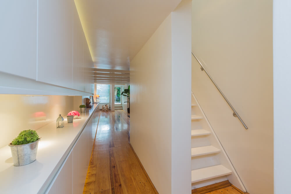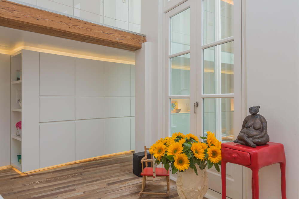 A long closet emphasizes the connection of the front and rear of the apartment with a special attention for the patio. Hanging steps make a subtitle additional entrance to the first floor.