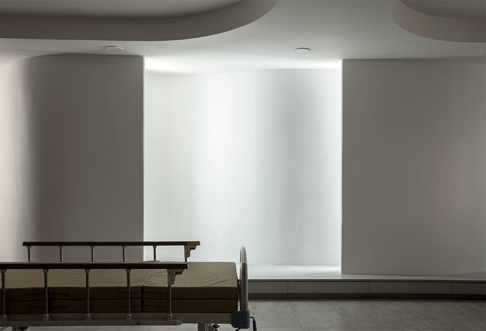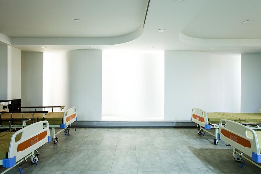 The wards were stacked vertically to accommodate the thirty beds. The building was detached from the ground to enable congregational and waiting spaces for the people. The services of the building were relegated to the rear and the terrace of the building was conceived to be a cafeteria. Light is used as a dominant material to design the interior spaces. The softness is achieved through the use and treatment of all materials in a way that they all melt into one cohesive element based on the detailing.