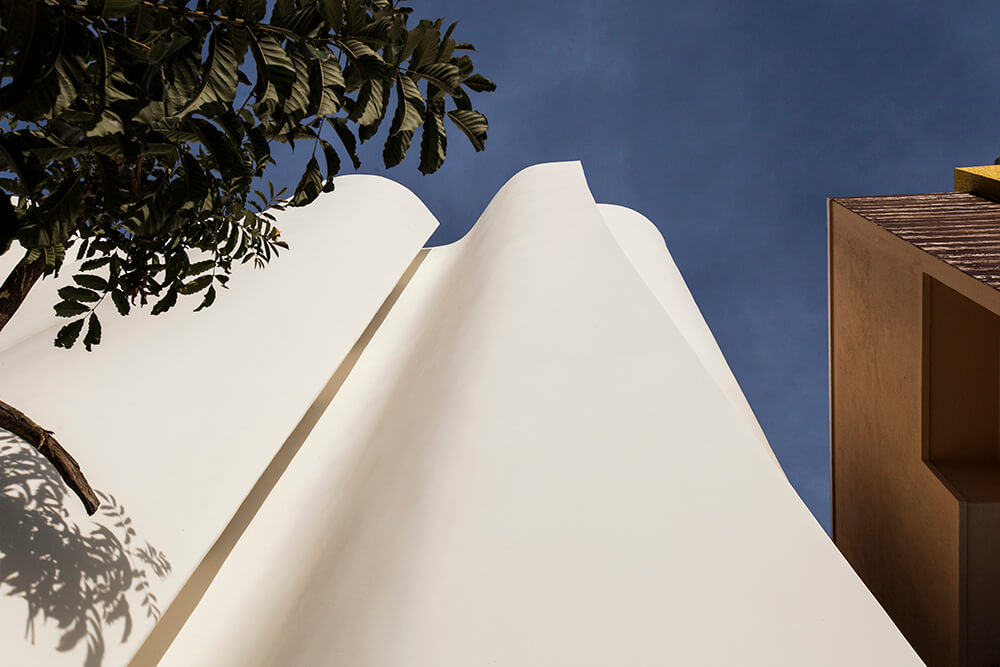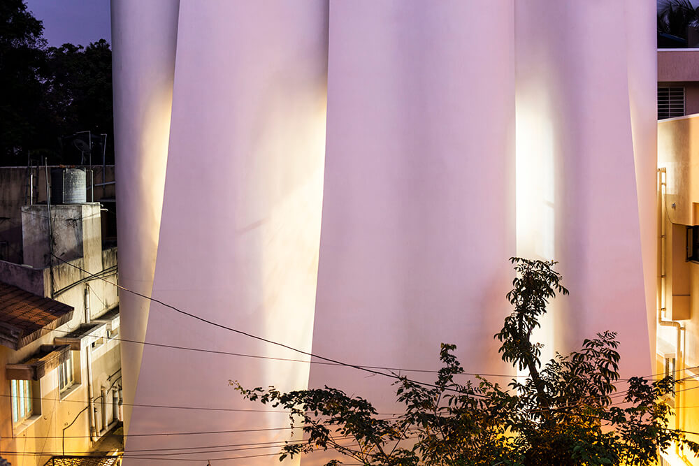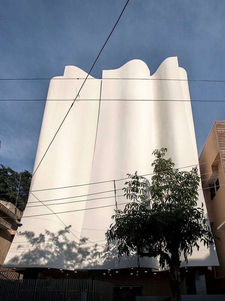 The building façade is formulated by surfaces built out of brick that has a bellowing quality about them; the sensual quality of the surface dematerializes the brick surface and renders an ephemeral feel to the building. The building skin is used as a filter to create light that is ethereal rendering a soothing feel to the wards. The slivers between the bellowing shells allow light to permeate into the building only to create a spatial and visual feel that is as divine as the temple outside.
