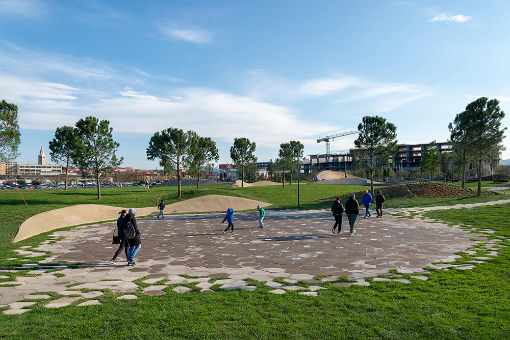 The planted portion of the landscape design is laid out only with indigenous Mediterranean vegetation. The strategically arranged tall growth complements the existing tree lanes on both edges of the park, gives shade to the individual programme zones, and offers the park area additional protection from the impacts of the surroundings. In order to encourage as much diversity in the use of its space, the new city park doesn’t feature traditionally designed footpaths. Interlocking paving with a free arrangement of grass-coloured tiles is limited to the access points and the sections of the park where a more intensive use of the ground is expected. In this way, the visitors define their own path and their own manner of using the space. In case new content is added to the park, or if obvious desire lines are formed, which is very difficult to predict initially, this manner of paving enables an easy rearrangement of the compacted surfaces at a later time.