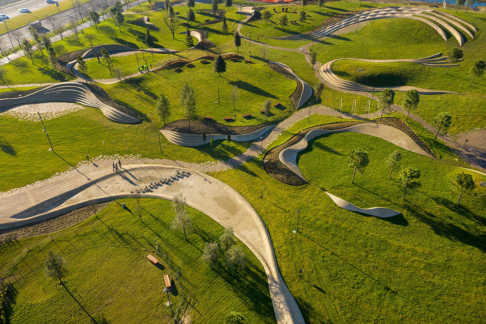 The area of the new city park covers a sizeable portion of the wider site and its design can thus serve as a prototype for further interventions. The new intervention offers a uniform and attractive appearance, and with its intensive hinterland greenery, it drowns the heterogeneity of the surrounding built structures. The fusing of the elements of a city beach and a contemporary city park encourages the area’s residents and visitors to use the space in different ways.