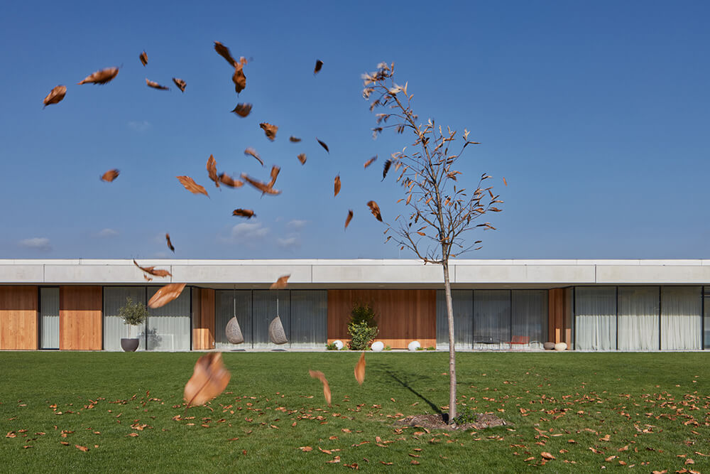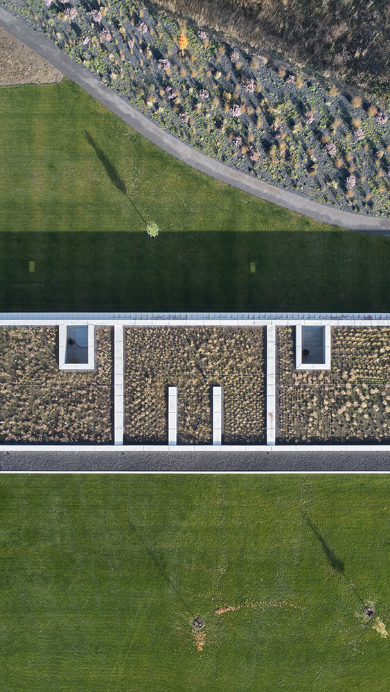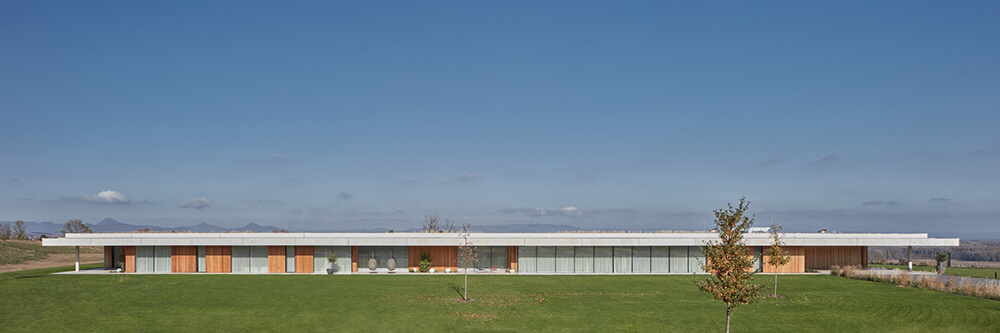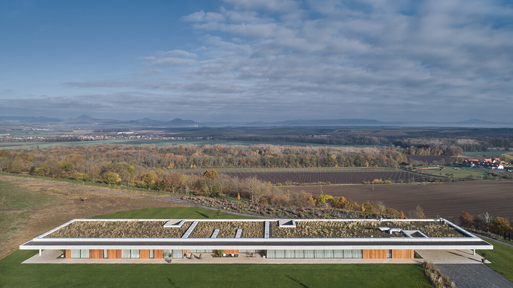 The fundamental concept of the design was the inconspicuous character of the whole complex when observed from a distance, but also its dispositional and, above all, functional simplicity. These principles led to a solution featuring several horizontal masses. Individual buildings are nestled on the plot in a logical layout – the property caretaker’s house is located near the entrance to the complex; the villa sits on the edge of the slope with views of the Czech Bohemian Uplands while standing on the leeward side of the terrain. Apart from these buildings, there is also the vineyard on the south slope, the wine cellar, tennis courts, the outdoor horse-riding area, and the heliport.