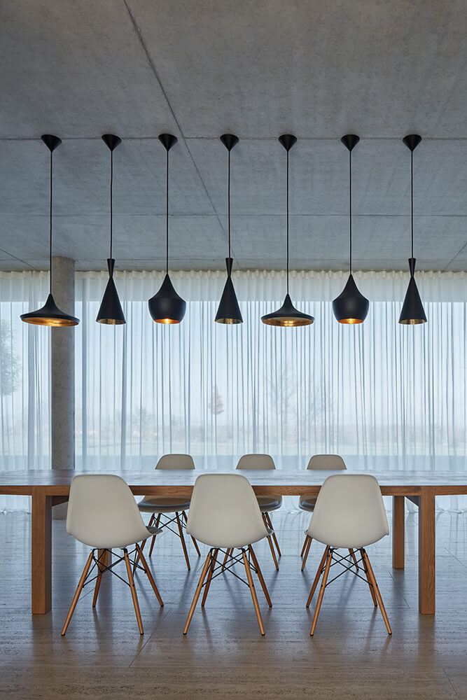 The site formerly housed an old brick factory complex. Flying above the location in a helicopter, the owner became fascinated by the site and immediately bought it. Initially, a small architectural design competition was held between three competing architects. Having won the competition the project was moved forward, and our studio proposed a design whose principal idea lay in utilising the house’s openings to provide views of the individual peaks of the Czech Bohemian Uplands. The central corridor of the house offers views to both Mount Říp and the ruins of the gothic Hazmburk castle; the dining room and kitchen provide a panoramic view of the whole Czech Bohemian Uplands.