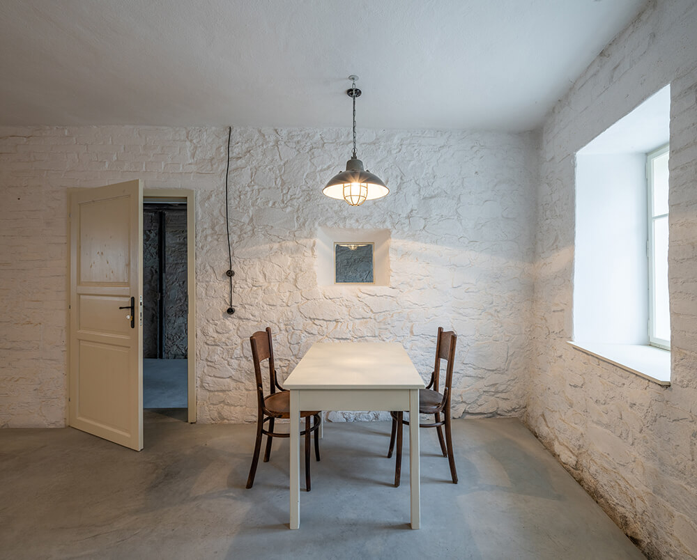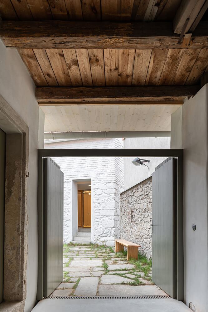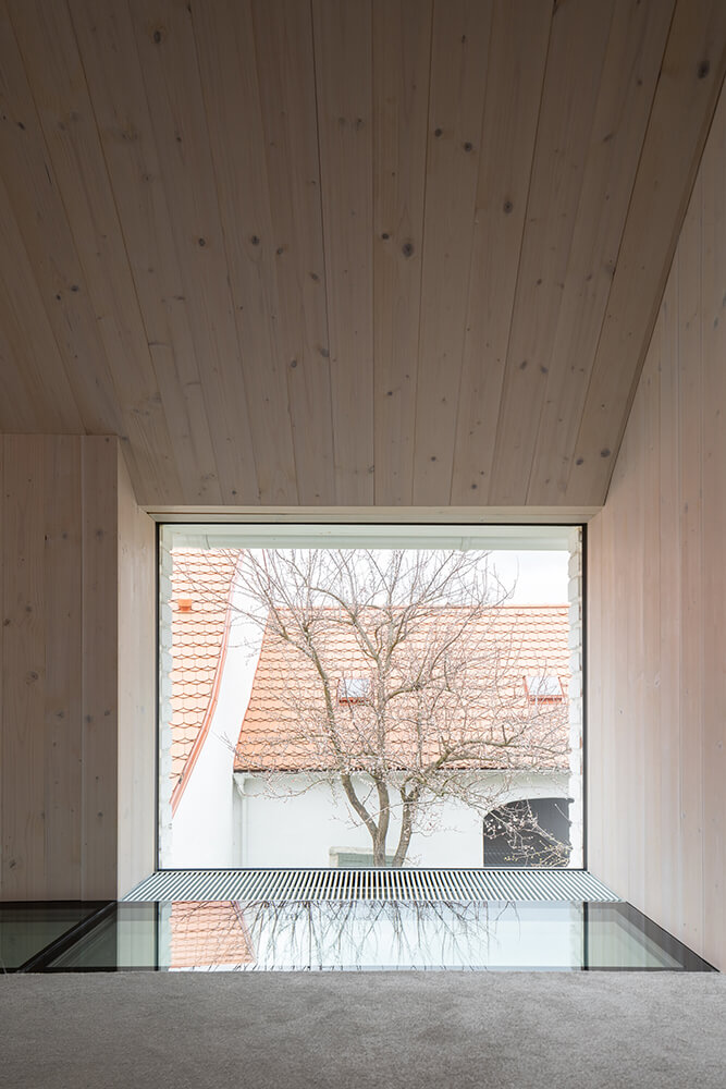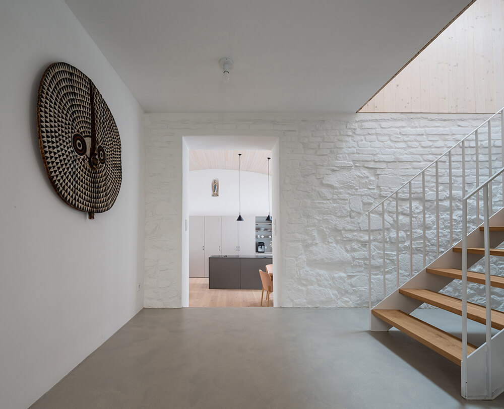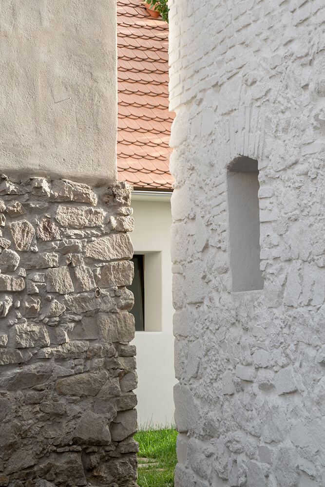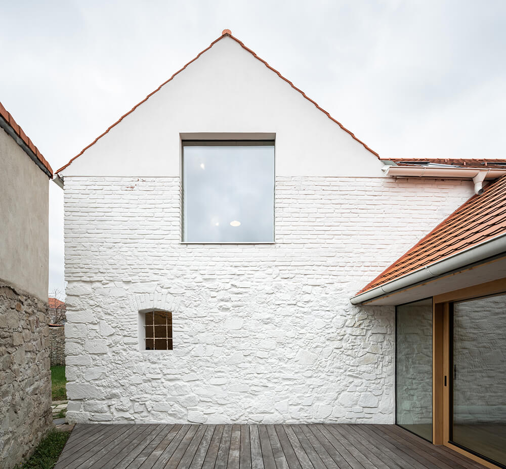 Our new home was created in a historical part of a small South Bohemian town, which, although neglected, possesses a rather strong atmosphere and potential. The place attracted us from the beginning for its distinctive character and great location. In the narrow sleepy streets, next to the grassy patch of the Kozina Square, we are hidden from the hustle and bustle of the surrounding traffic, while only a few steps separate us from the town center with shops, services and offices, schools, cinema, theater and railway station. We perceive the reconstructed house as an alternative to suburban villas which sometimes disproportionately cut out of our landscape. On a significantly smaller area, we are implementing a building program which includes a sufficiently large living room with an adjoining outdoor terrace, an attic with children’s rooms and a playroom, a bedroom with its own bathroom, a garden with fruit trees, two garage spaces and a large workshop with a car lift. The residential building is created by connecting two neighboring houses. One of them underwent a significant reconstruction at the turn of the millennium, the other one is in a state of disrepair. We are getting rid of the unsuitable modern elements, such as a large dormer with a balcony and plastic windows. Behind brick backing we discover original stone masonry and small historical fragments which hold value for us. We respect the basic shape, scale and materiality of the original masses. We adjust the internal disposition in an effort to make the building accessible from two sides – for pedestrians from the square and for cars from the opposite side. The large window in the gable of the courtyard facade is an answer to the unique view of the church tower. Views from the interior of the courtyards enrich the overall perception of the space. We intentionally leave the newly created openings minimalistic to create a contrast with the original traditionally divided windows.