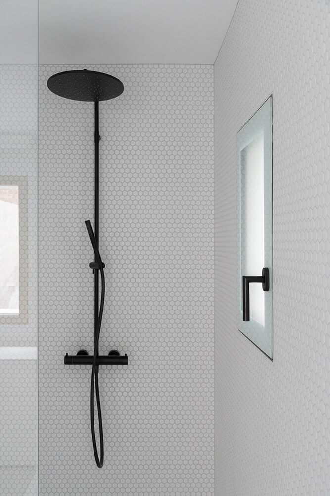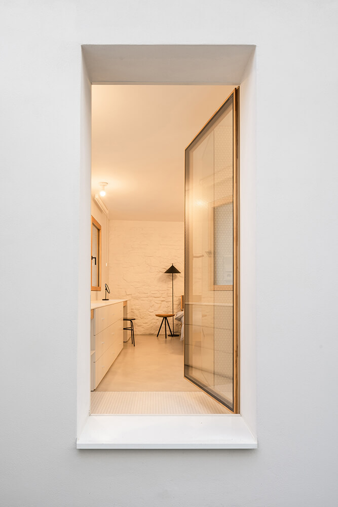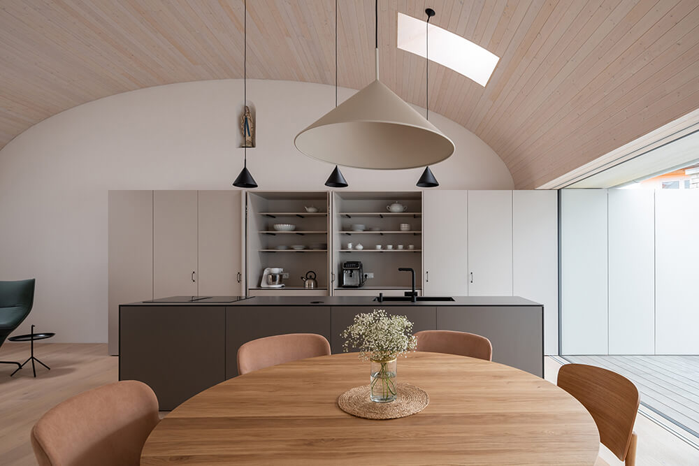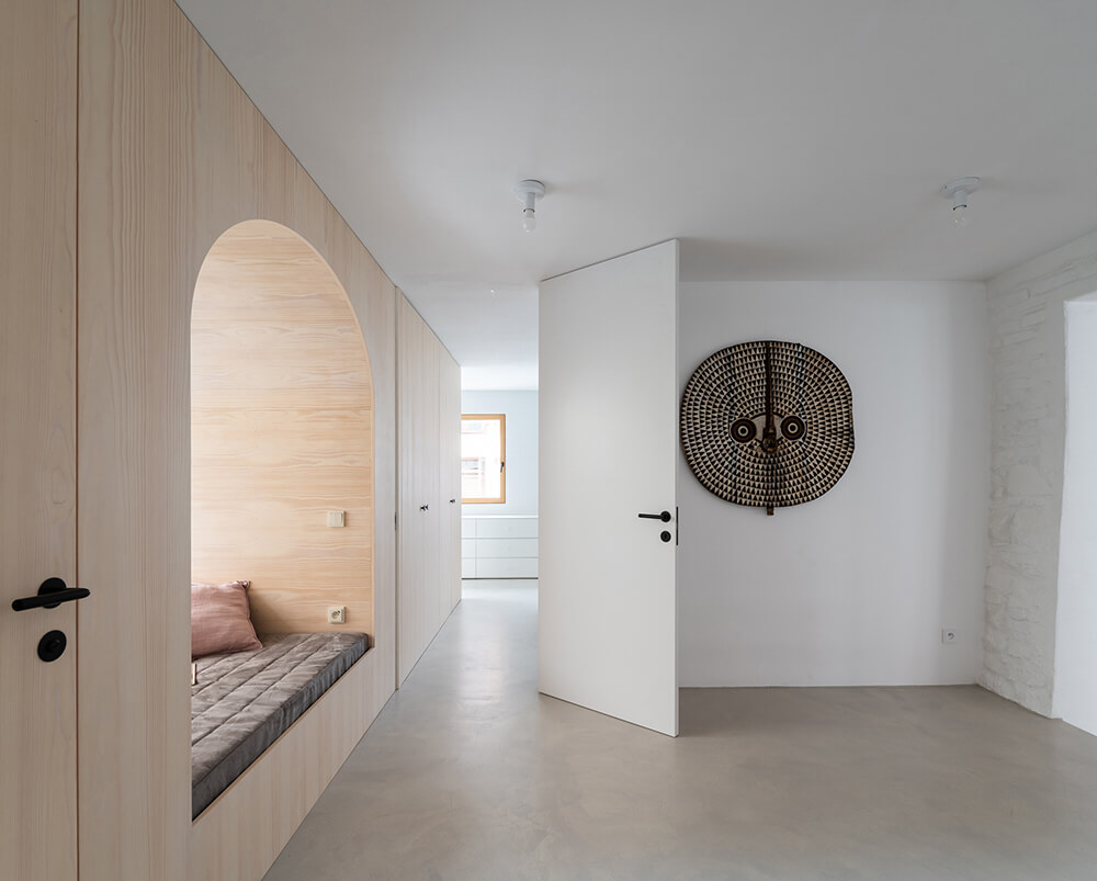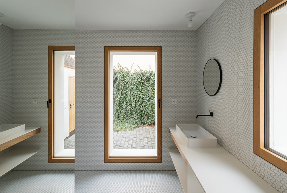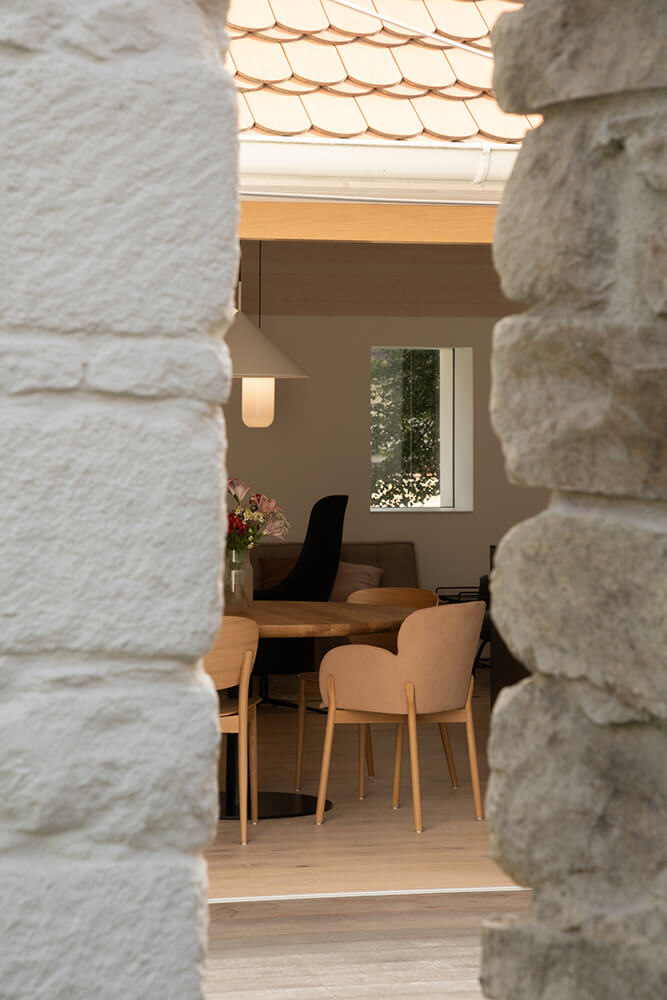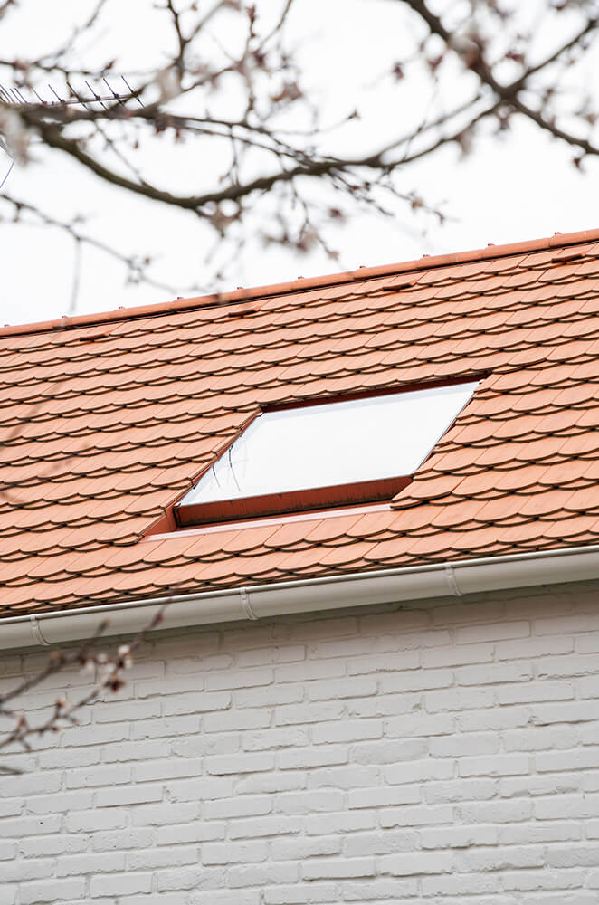 Our new home was created in a historical part of a small South Bohemian town, which, although neglected, possesses a rather strong atmosphere and potential. The place attracted us from the beginning for its distinctive character and great location. In the narrow sleepy streets, next to the grassy patch of the Kozina Square, we are hidden from the hustle and bustle of the surrounding traffic, while only a few steps separate us from the town center with shops, services and offices, schools, cinema, theater and railway station. We perceive the reconstructed house as an alternative to suburban villas which sometimes disproportionately cut out of our landscape. On a significantly smaller area, we are implementing a building program which includes a sufficiently large living room with an adjoining outdoor terrace, an attic with children’s rooms and a playroom, a bedroom with its own bathroom, a garden with fruit trees, two garage spaces and a large workshop with a car lift. The residential building is created by connecting two neighboring houses. One of them underwent a significant reconstruction at the turn of the millennium, the other one is in a state of disrepair. We are getting rid of the unsuitable modern elements, such as a large dormer with a balcony and plastic windows. Behind brick backing we discover original stone masonry and small historical fragments which hold value for us. We respect the basic shape, scale and materiality of the original masses. We adjust the internal disposition in an effort to make the building accessible from two sides – for pedestrians from the square and for cars from the opposite side. The large window in the gable of the courtyard facade is an answer to the unique view of the church tower. Views from the interior of the courtyards enrich the overall perception of the space. We intentionally leave the newly created openings minimalistic to create a contrast with the original traditionally divided windows.