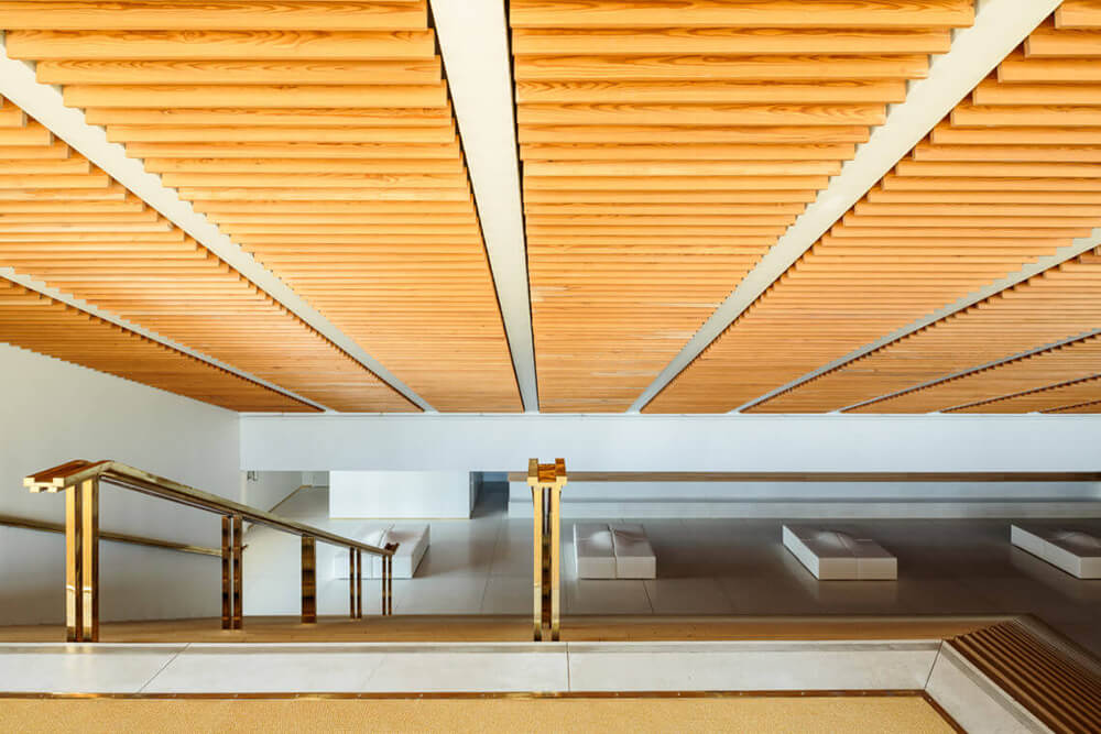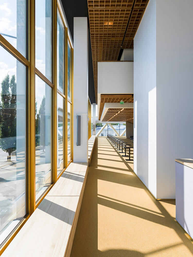 The public foyer is extended between the old and new volumes as a bridge-like angled space, which floats above the new outdoor auditorium created between the two volumes.