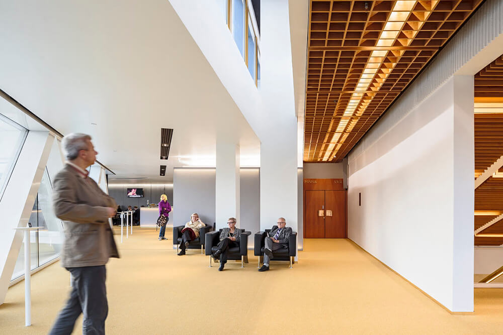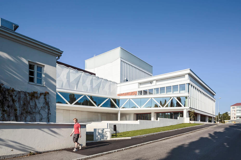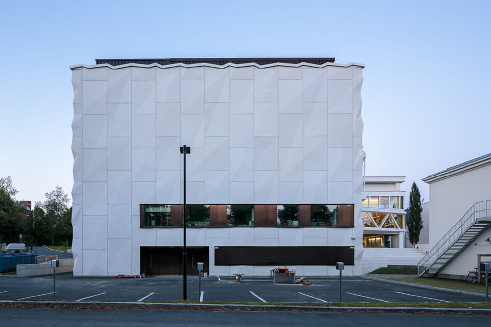 The old building has a beautiful and timeless material palette consisting of white concrete panels, glass and terracotta tiles. The extension is clad in white concrete panels with a wrinkled, varying surface form, which indicates a similar acoustically optimized cladding inside the new hall.