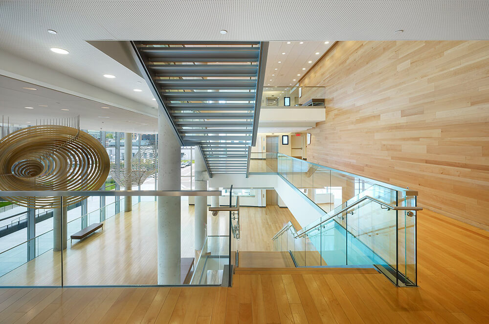 On the façade, an outer wrapper – in glass, stone, and wood – provides sound isolation for the concert hall while offering patrons beautiful views of the urban landscape of Montreal. Tall sculpted wood forms, visible from the exterior, rise through the building to emerge wave-like and define the architecture.