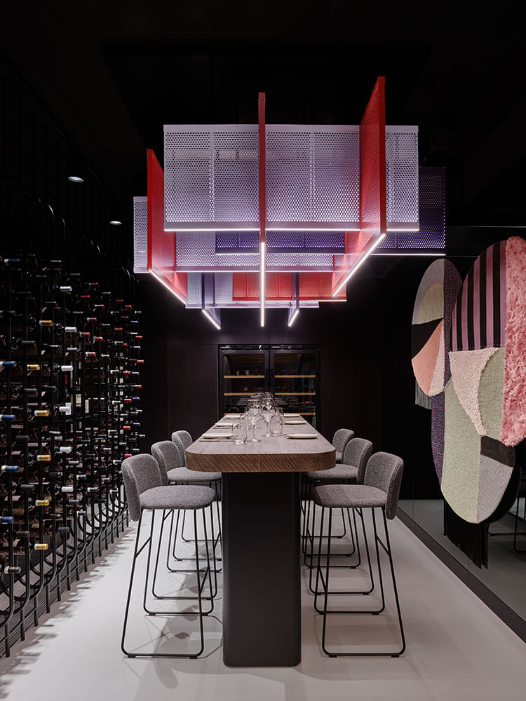 An atmospheric adventure of smells, sounds and tastes – not forgetting colours and fabrics – awaits you in the dining area. The aim here was to render Object Carpet’s furnishing expertise tangible – in a subtle yet palpable way. Thus textile wall collages of damask and hessian enter into tantalising dialogue with carpet and cord. At the same time, a window into the kitchen opens up a direct visual connection to the chef. Allowing the food to then speak for itself. So much lust for life calls for a toast: Ideally, in the well-stocked vinoteca, which is certain to prove the perfect setting for many exciting encounters – and for one or the other new vision. With this in mind, please raise your glasses!