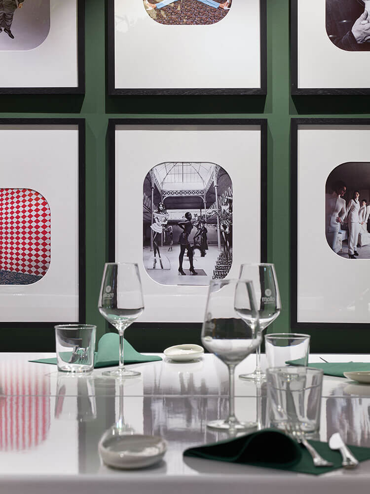 Vincenzo and Daniele, two Stuttgart restaurateurs who have known each other since their early childhood in southern Italy, are in charge of food and drink. Their shared history provides a point of departure for the menu. Moreover, the logo is based on their shared origins: soft, round and warm like the feeling that spreads throughout your body when you think of sunnier climes, yet at the same time modern and unorthodox. Like the restaurant, the menu also comes in three integrated parts that breathe the spirit of the textile collage on the walls. Every detail of the colour-play is meticulously coordinated with the interior: in sync with the brilliant blue of the entrance area, combined with muted beige tones, inspired by the leather upholstery of the armchairs and tables. On the walls, portraits by Michel Comte throw open a window to the world: Framed personalities from art, fashion and music tell a free-spirited narrative of memory. Just like the namesake of Marie-Curie-Strasse, the street in which La Visione stands – and probably the only element of the design concept that was not a deliberate move on the part of the identity architects.