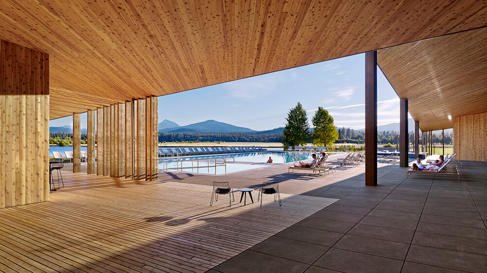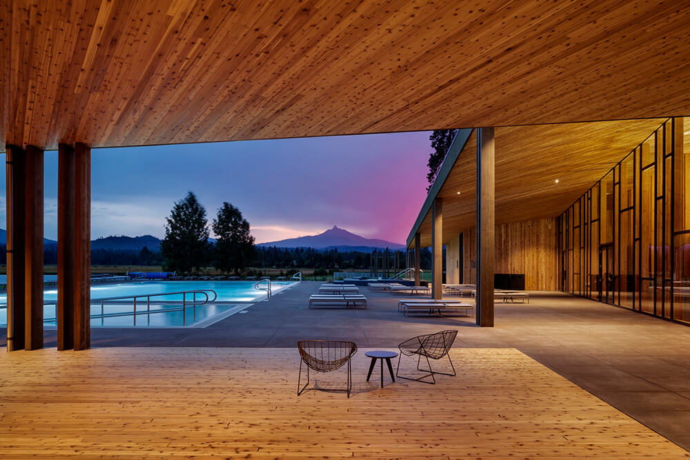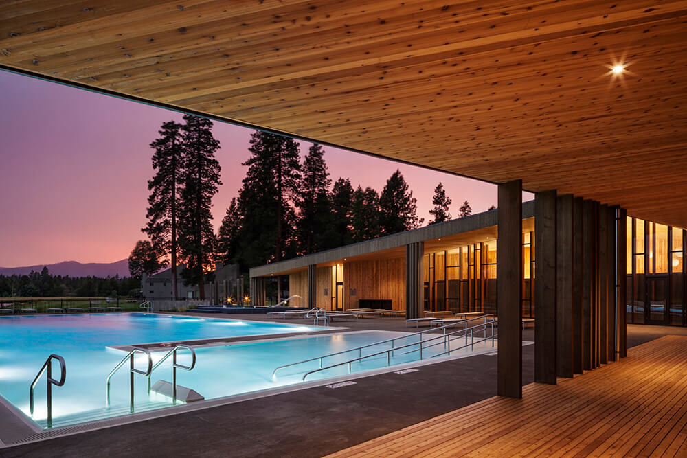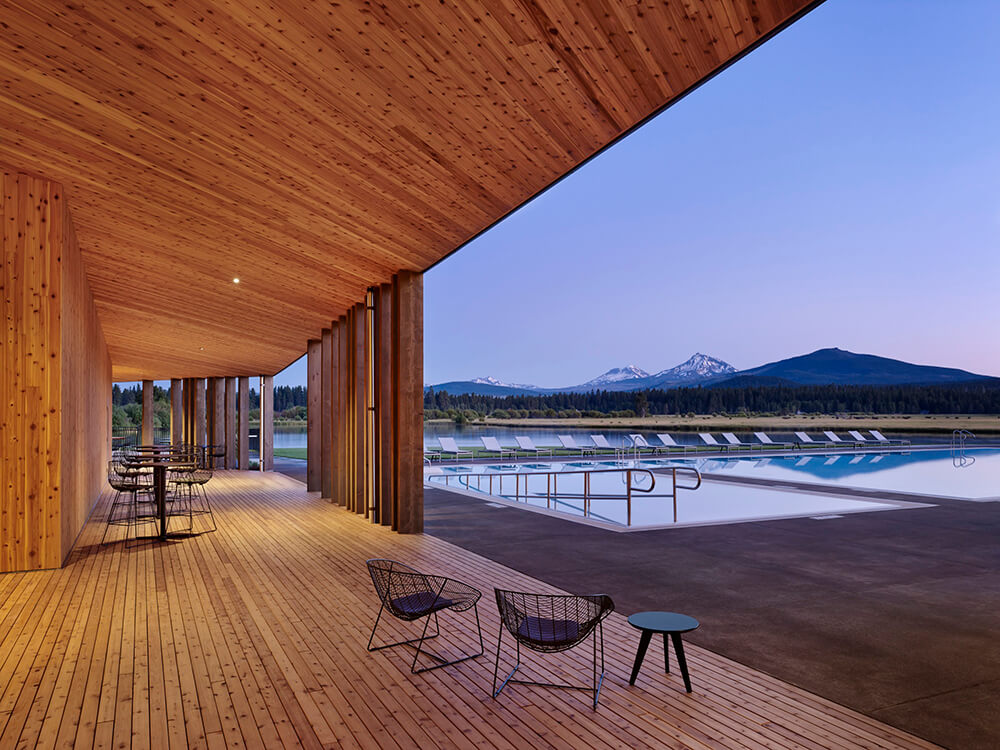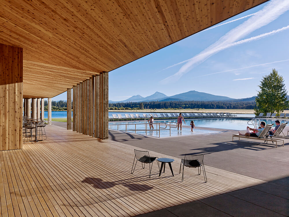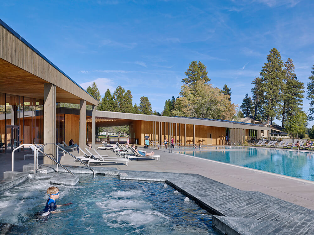 Black Butte Ranch – an iconic resort community located near Sisters, Oregon – sits at the gateway to Oregon’s high desert. First planned in the early 1970s, the Ranch is a vacation destination for many, and a year-round home for some. The new 15,000-square-foot “Lakeside” replaces the well-worn main pool facility and revives the “heart” of the Ranch. The two buildings house a Bistro with indoor and outdoor seating, an outdoor pool and hot tub, locker rooms, a fitness room, an activity center for kids and teenagers, and an outdoor play area for kids. The design set out to do three things: evolve the legacy of Pacific Northwest regional modernism at the Ranch, intensify the connection to the landscape, and enhance the user experience.