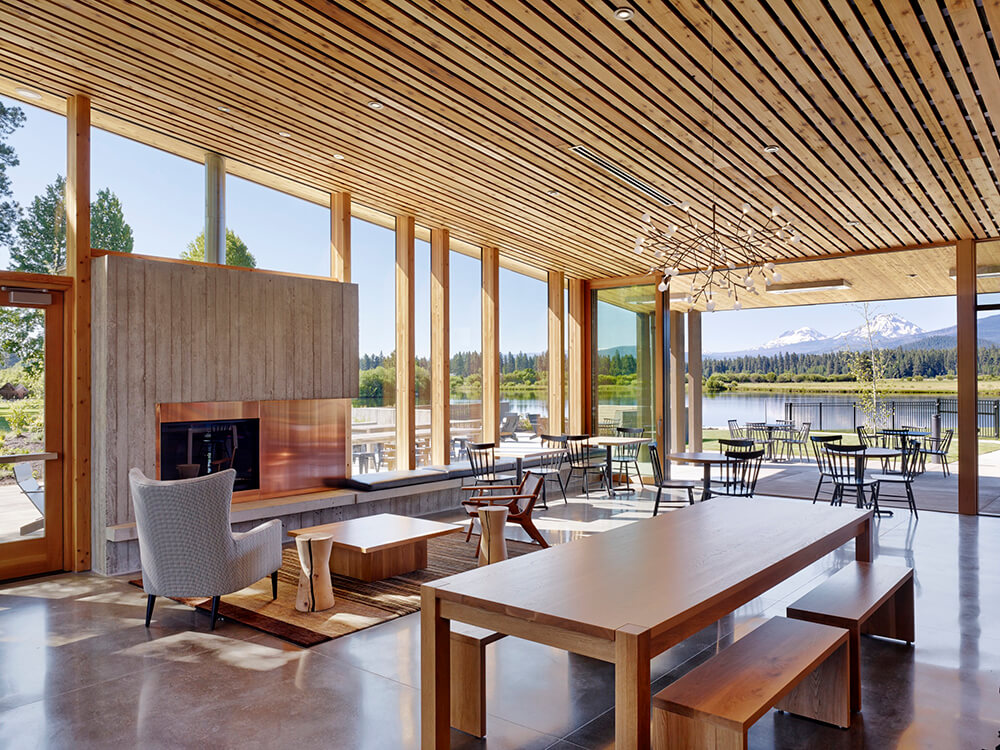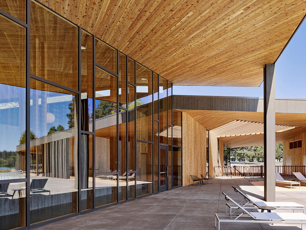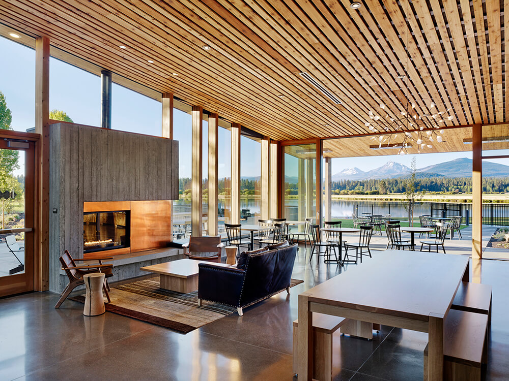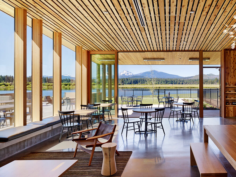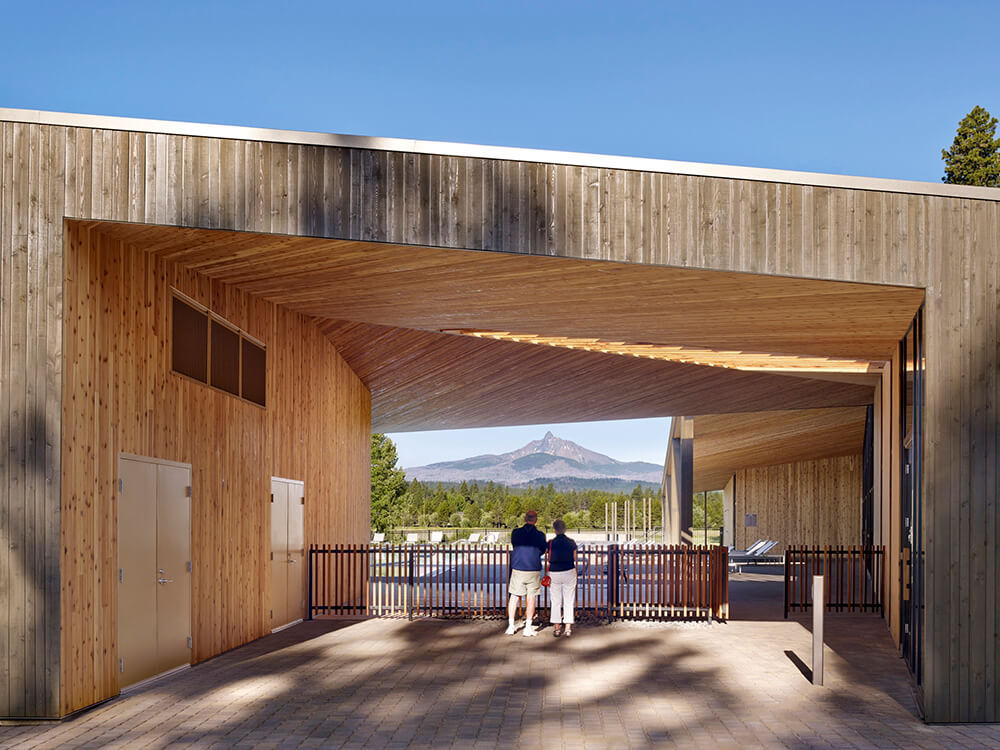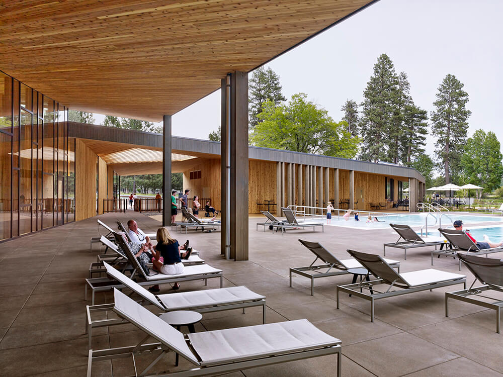 Black Butte Ranch – an iconic resort community located near Sisters, Oregon – sits at the gateway to Oregon’s high desert. First planned in the early 1970s, the Ranch is a vacation destination for many, and a year-round home for some. The new 15,000-square-foot “Lakeside” replaces the well-worn main pool facility and revives the “heart” of the Ranch. The two buildings house a Bistro with indoor and outdoor seating, an outdoor pool and hot tub, locker rooms, a fitness room, an activity center for kids and teenagers, and an outdoor play area for kids. The design set out to do three things: evolve the legacy of Pacific Northwest regional modernism at the Ranch, intensify the connection to the landscape, and enhance the user experience.
