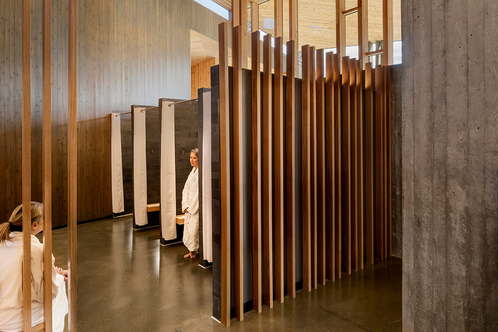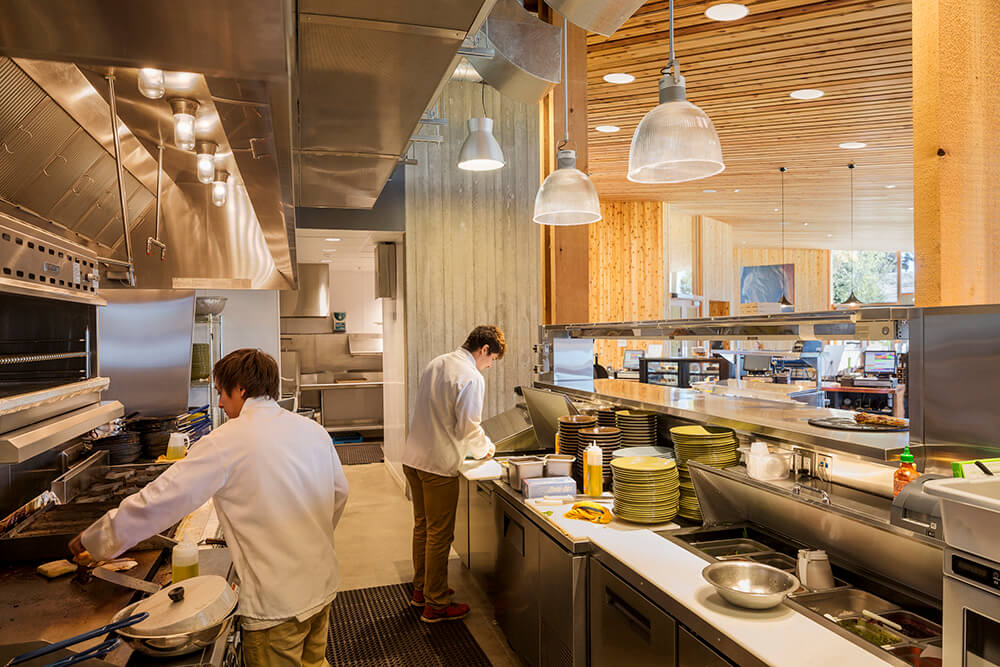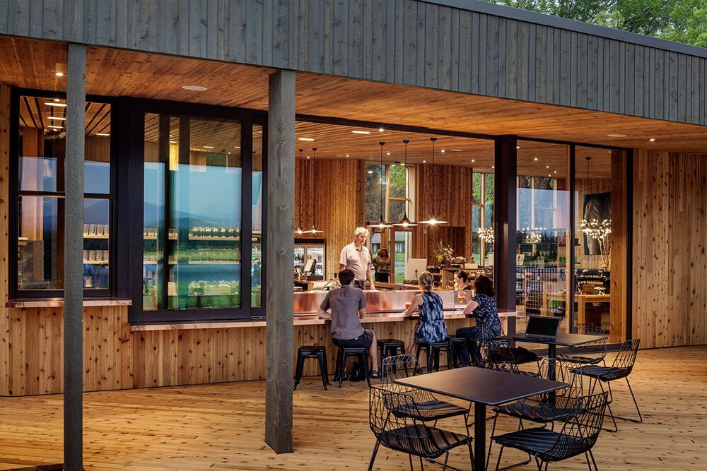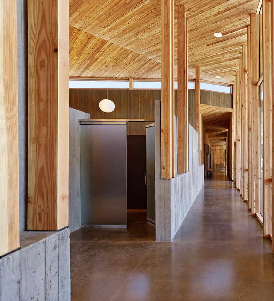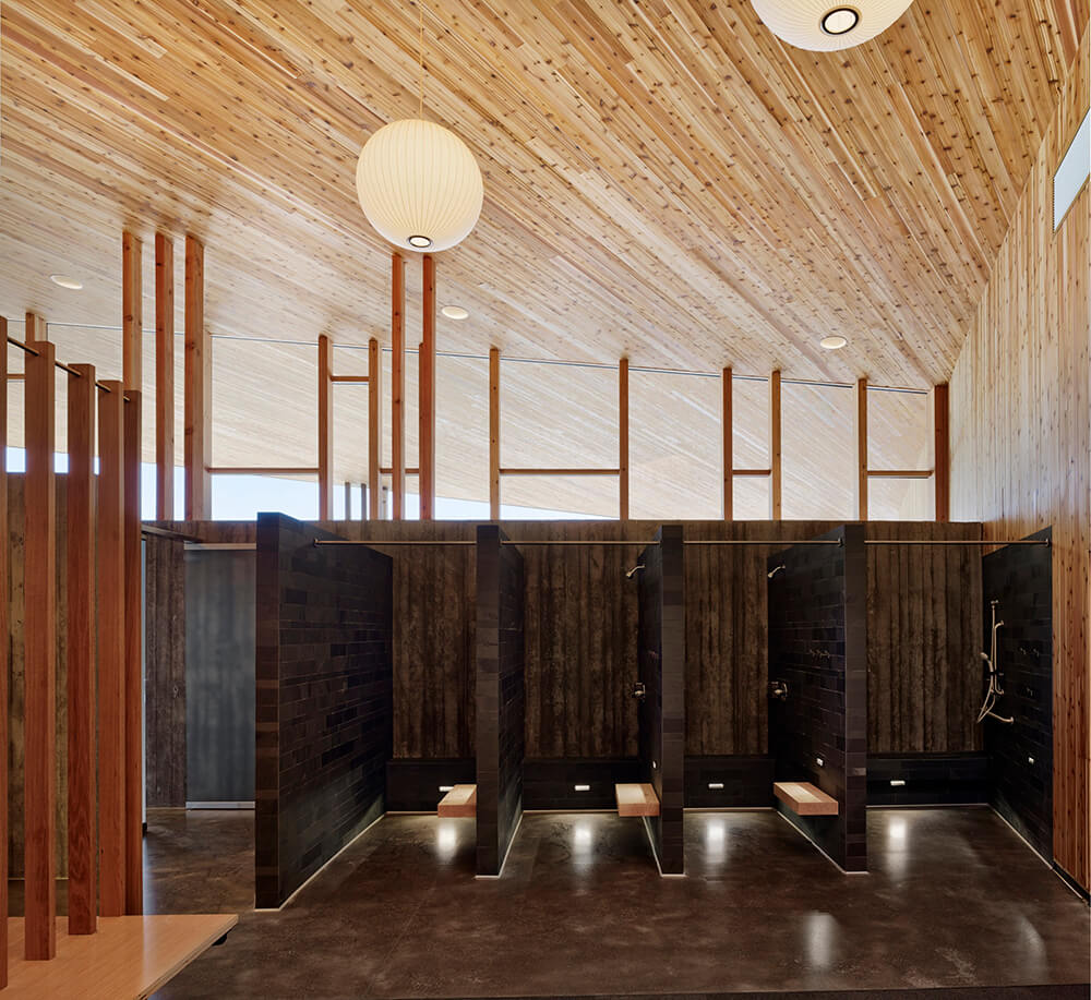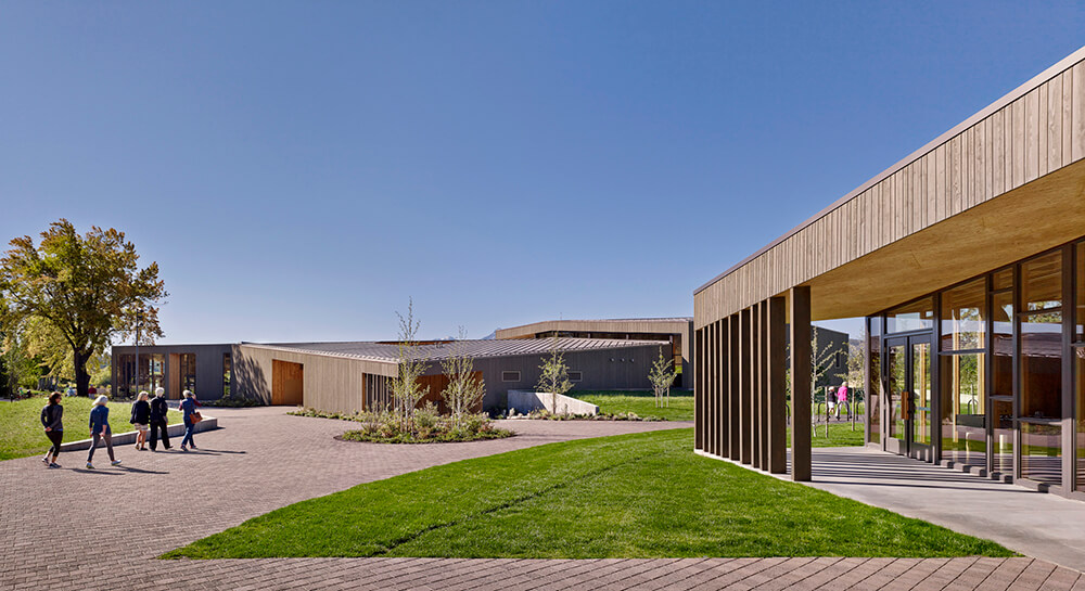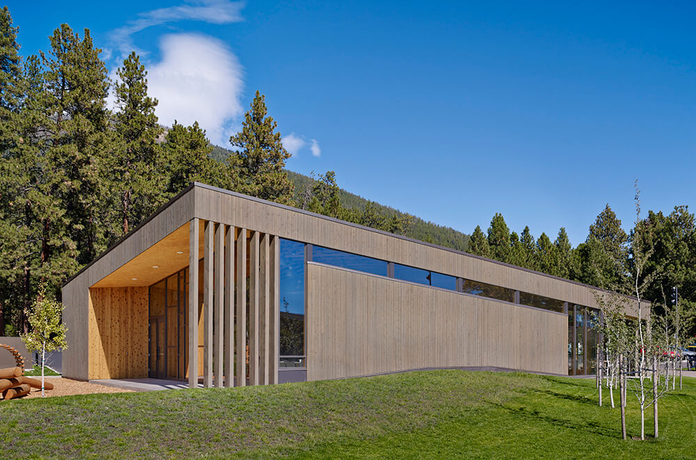 By creating a variety of spaces at the boundary between inside and outside, the design offers varied levels of connection to the landscape as well as opportunities for both solitude and community. The Bistro has indoor and outdoor dining and fireplaces located for cozy winter mornings as well as summer evenings. Deep overhangs provide shade in summer and warming in winter, while reducing glare to the interior from the intense high desert sun. The activity center gives kids (and parents) a place to be kids with an unfinished interior that can take the wear and tear of messy art projects and even water balloon fights.