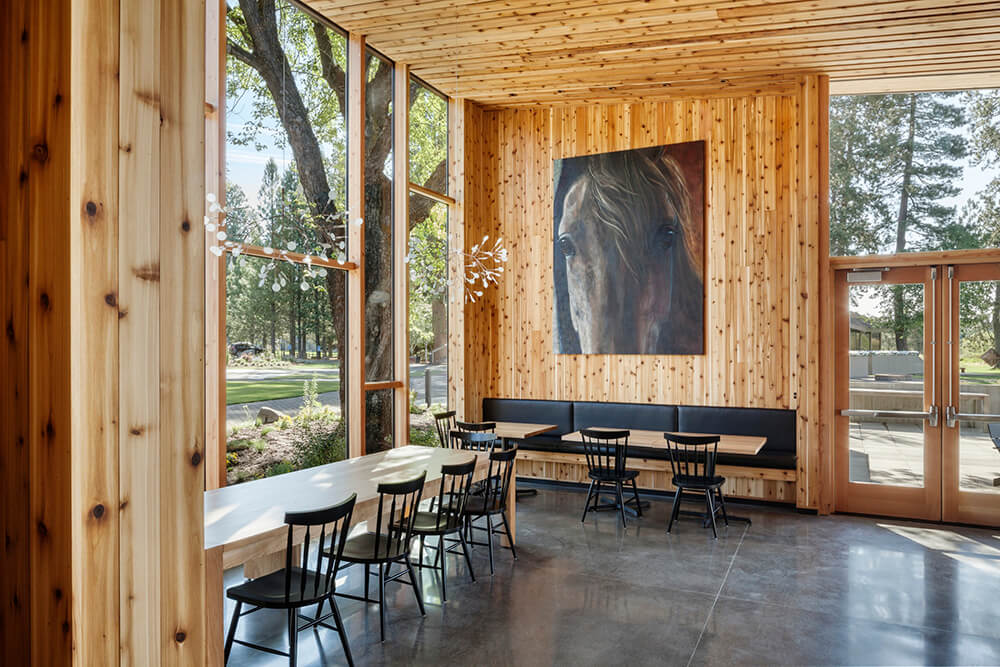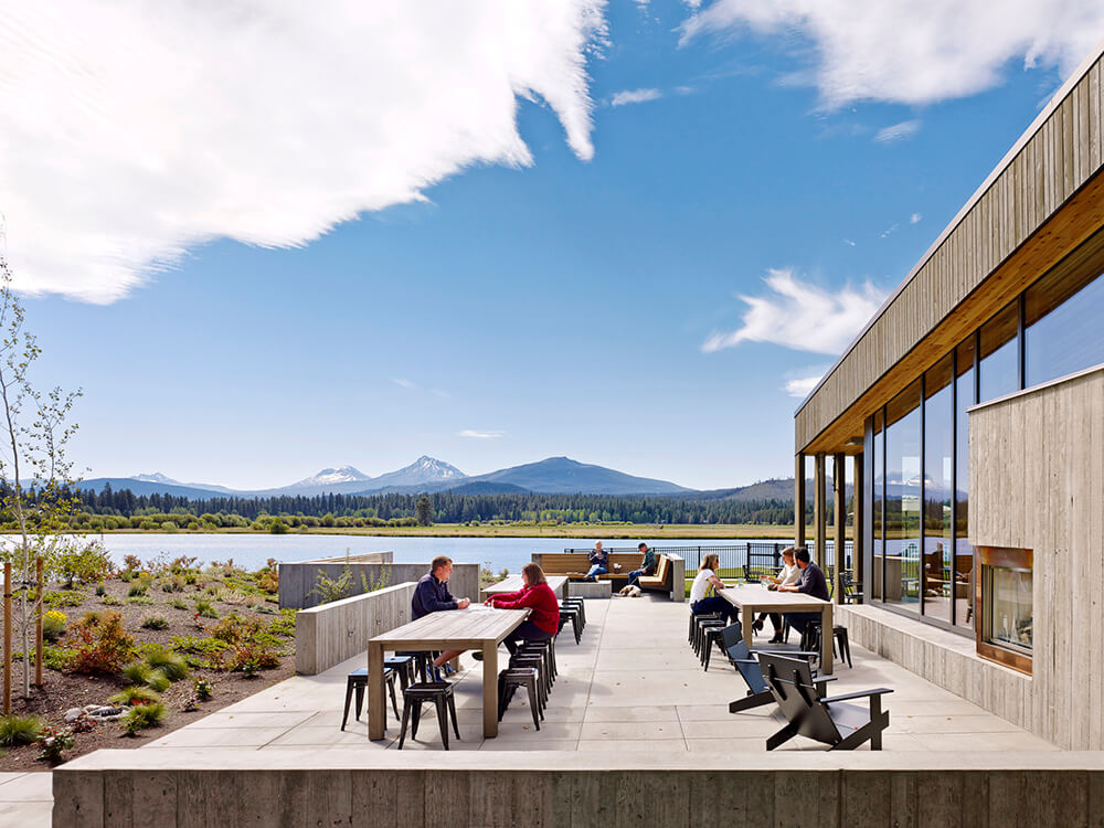 The site design continues the classic Black Butte Ranch arrival sequence: sweeping movement traveling through the site with unfolding views of the Cascade Mountains. The new buildings are arranged along an arcing pathway with each new building having its entry on this path. Openings, breezeways, and overhangs become apertures for distilling the volcanic landscape into distinct moments, unfolding to weave the horizon of the Three Sisters and Mt. Washington into the spaces.
