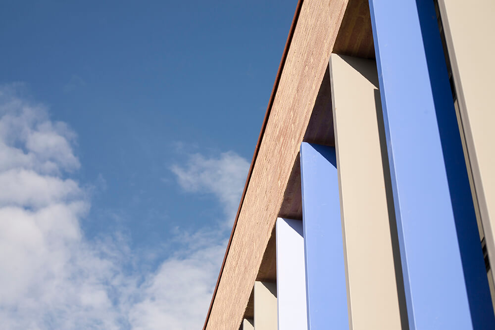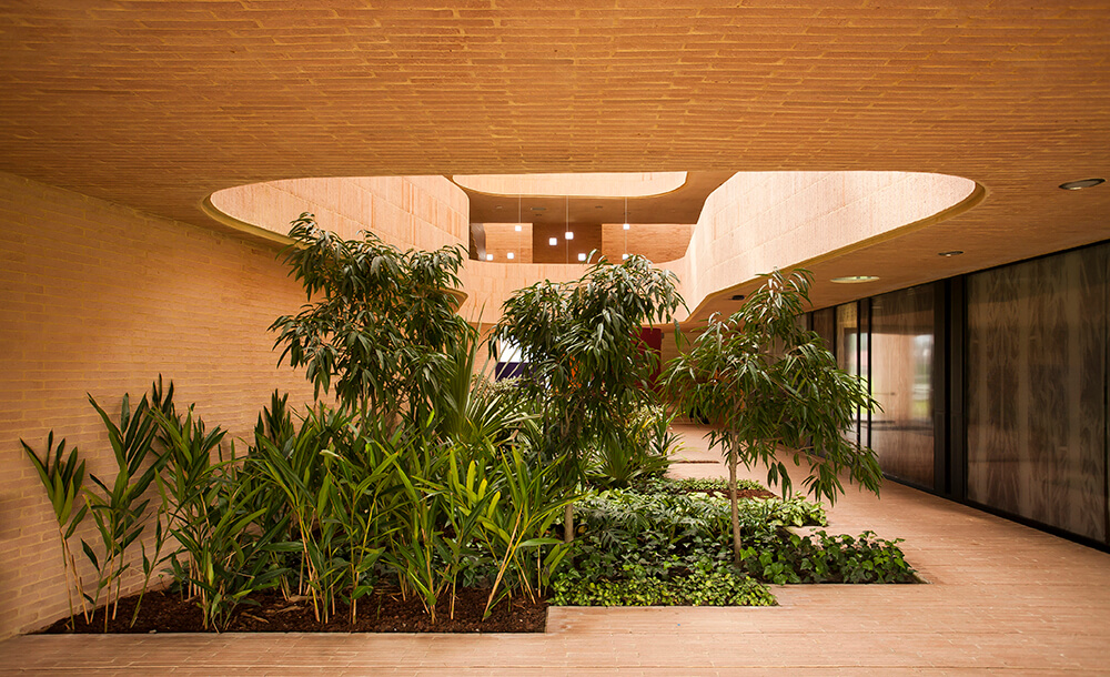 The particular variation of the building, consists in developing a sinuous atrium with an internal garden. The exterior was defined by two closed sides facing the large green extensions, and by two glass façades with vertical sun shields where the classrooms operate.