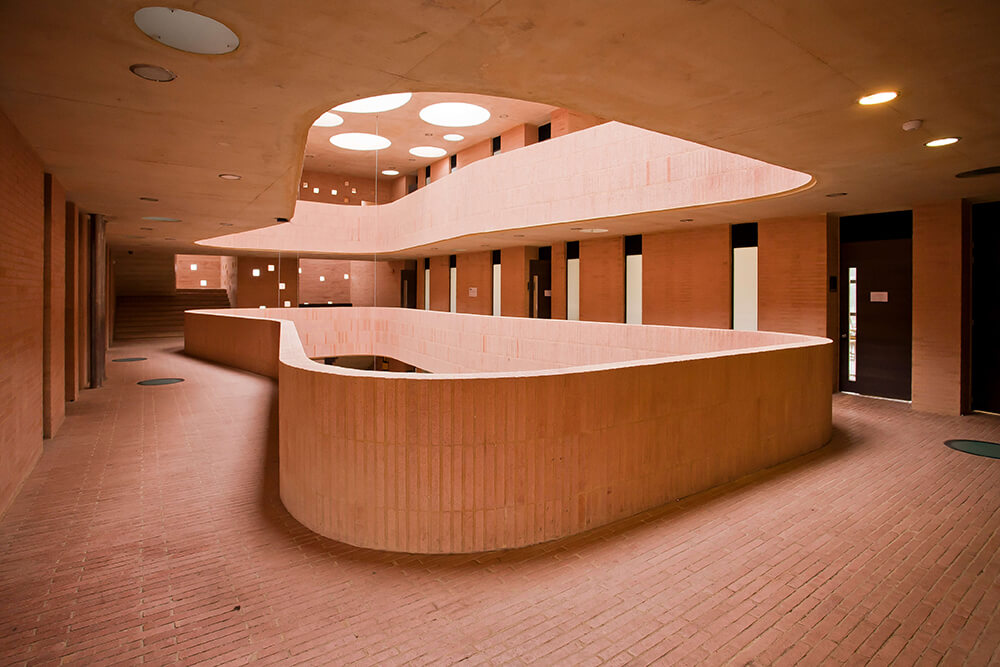 This High School building completes the group of classroom-buildings; therefore it resumes the usual typology of the surroundings, a central open space with peripheral classrooms. It’s also chosen to use brick walls, the predominate material of the school.