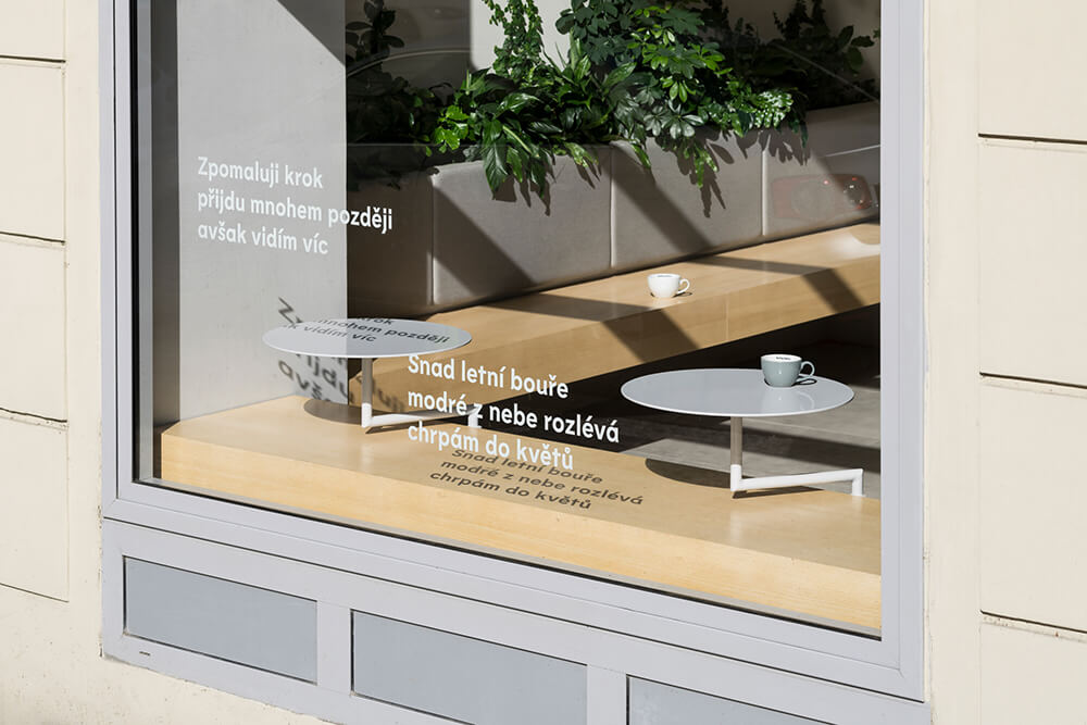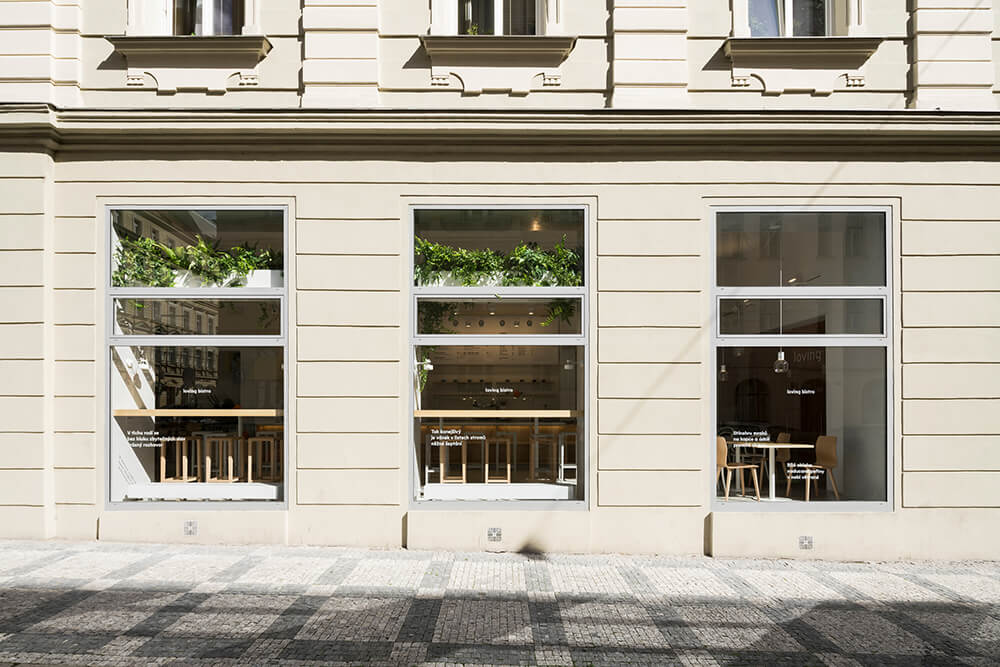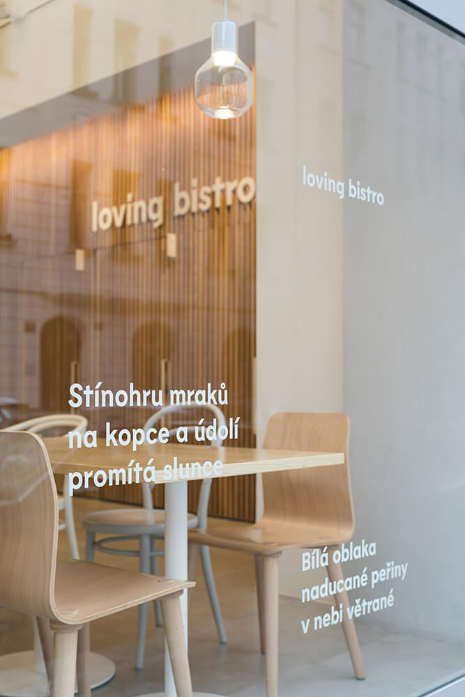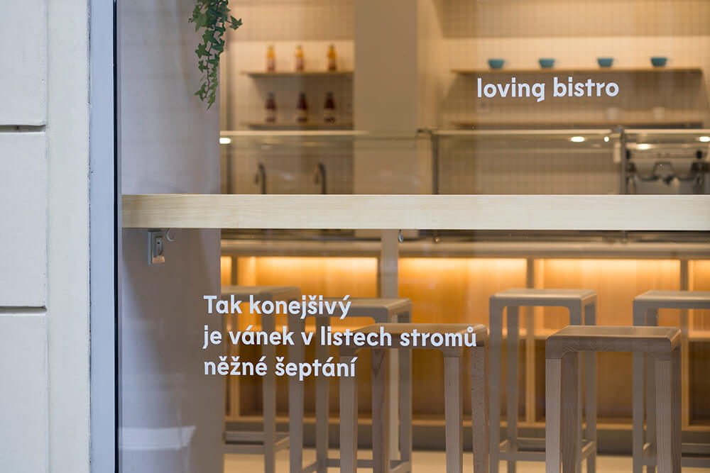 Whoever is not nourished enough with just the beauty of Petr Petřiček’s verses is welcome to enter, as well as those who only pass by the haiku and just want to eat, meet someone or be alone for a bit while observing the outside hustle. The lightness and calm atmosphere emerge not only from the open space, high ceiling and good light, but also from the new concept of a vegan bistro based on the investor’s many years of experience and his casual approach to veganism and life. With a bigger team, formed on previous realizations of the Loving Bistro chain, we managed to create a place that offers various choices on the lower edge of Prague’s Letná.