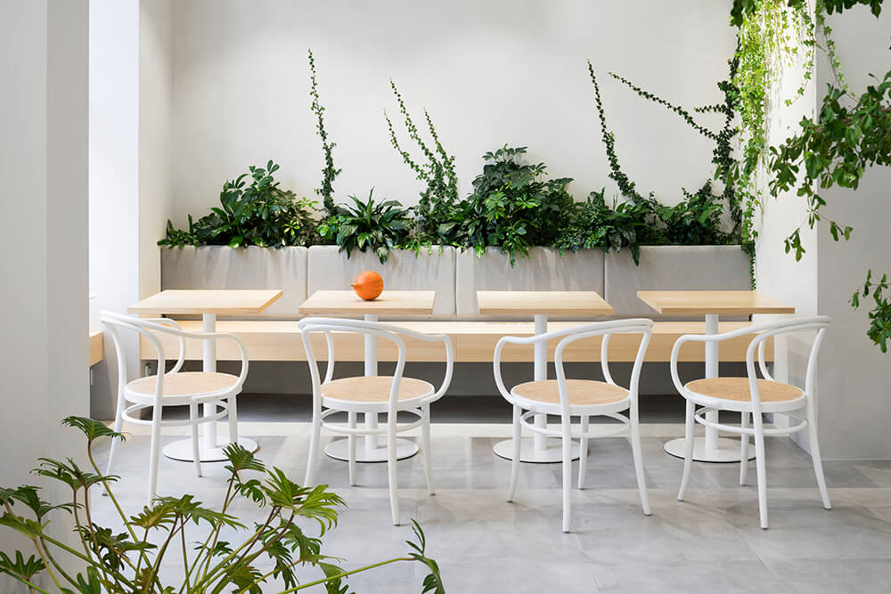 Clean, minimalist surfaces are deliberately designed as a neutral background for the color of food, people and events inside. The space is dominated by a wooden self-service counter with a glazed refrigerated display case and the necessary gastronomic equipment. The main view, framed by four regular portals, is closed by a wooden lamella wall with hidden doors to the guests’ facilities. Other wooden elements are also made-to-measure from ash tree, which colors up the interior built on a combination of light gray finishes, lasure coating and ceramic mosaics. Everything is connected by pure white painting and interior greenery growing in various forms of space.