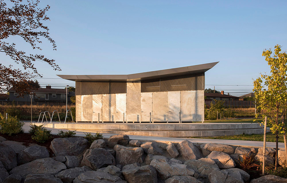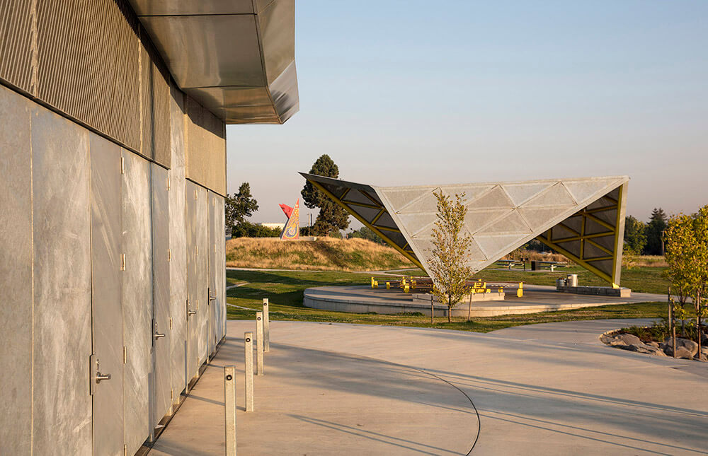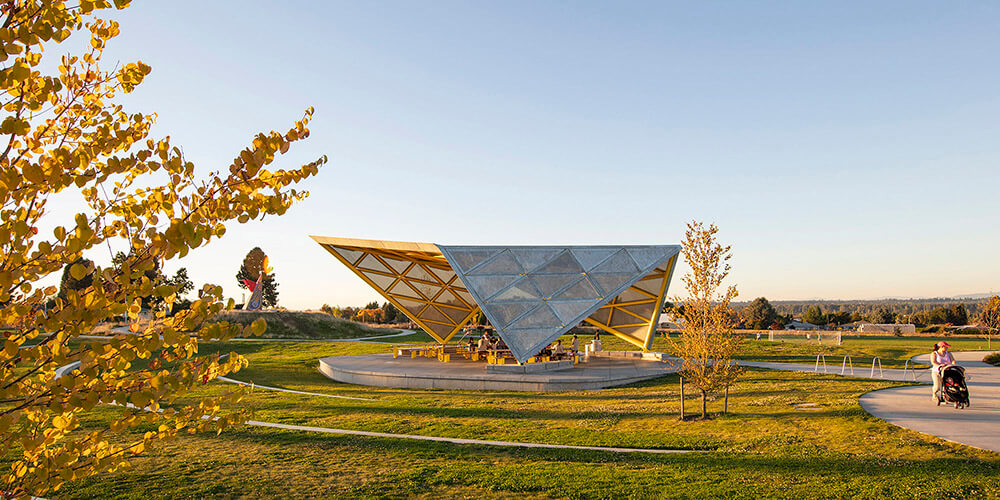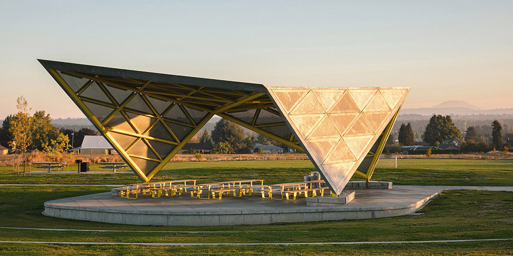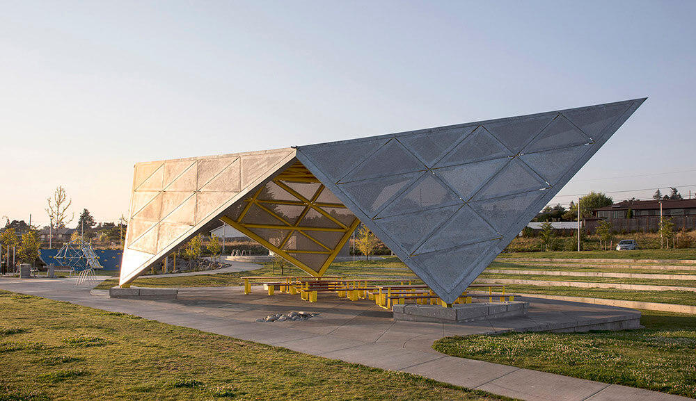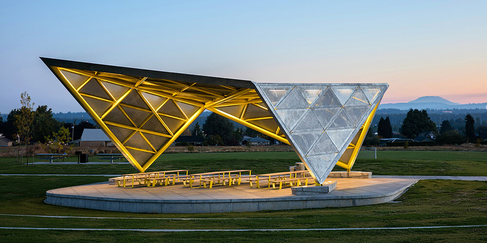The signature element, a 1,760-square-foot multipurpose shelter, is made from a series of interconnected equilateral triangles of perforated and galvanized steel plate. The folded angular form takes its inspiration from the triangulated peaks of the surrounding mountains, Native American plank houses and river fishing platforms. A simple steel pipe frame supports the shelter to create a flexible space for picnic gatherings or summer concerts. By celebrating the structure’s tectonics and revealing the means of construction, the structure serves to honor the economy and beauty of native structures built by the original inhabitants of the area. Axial connections through the park enhance user awareness of the world beyond the park. Park program elements and trees are arranged to manipulate view corridors to Mt. Hood and Mount St. Helens and help to organize other site elements including a small steel-clad restroom building. At the highest point on the site a conical mound recalls the volcanic cinder cones on the horizon. Visual connections between key park elements articulate the experience along and across the axis.