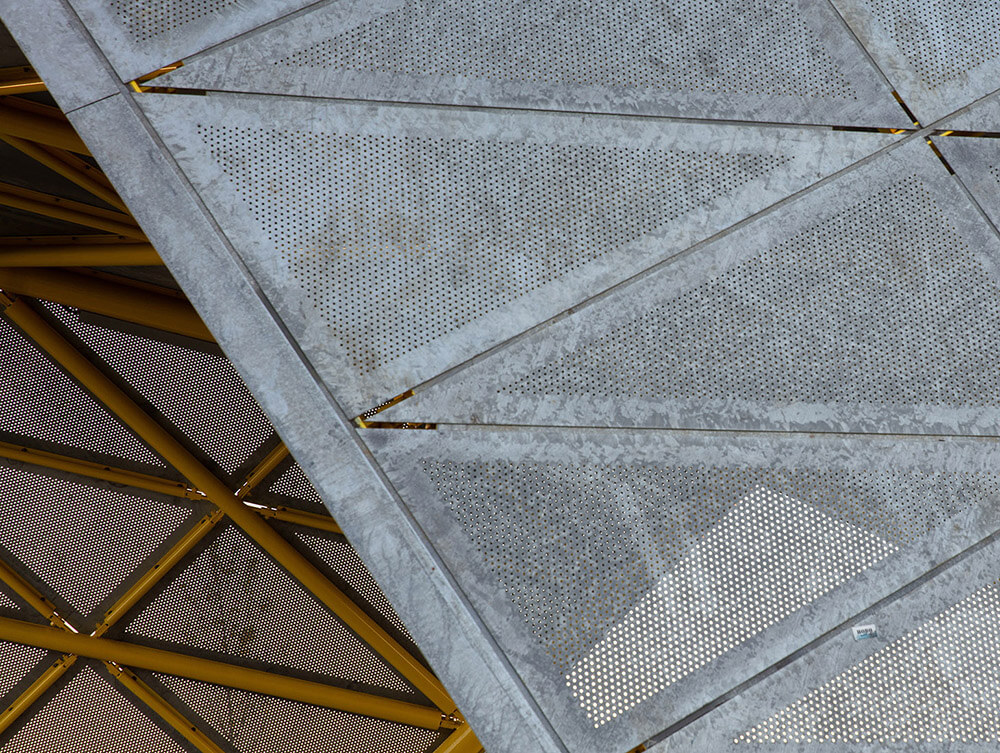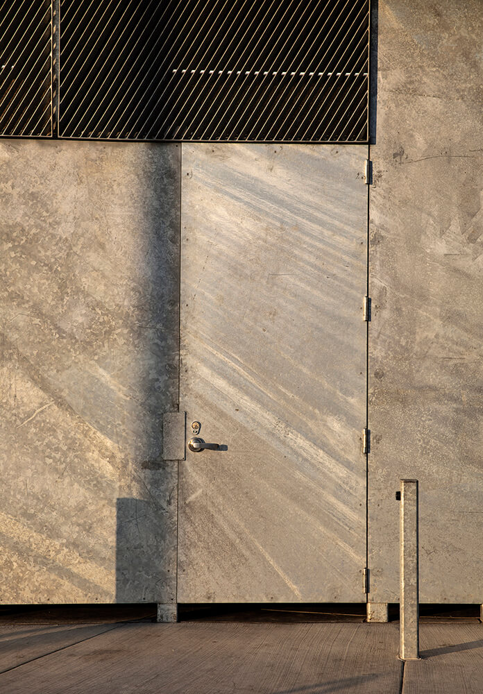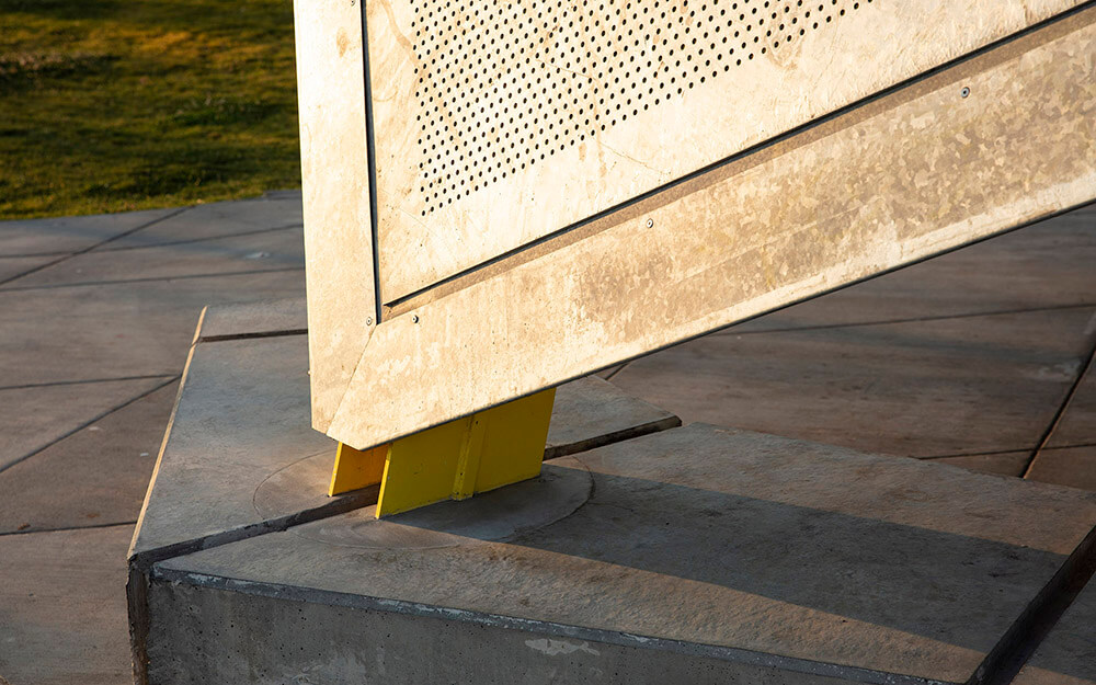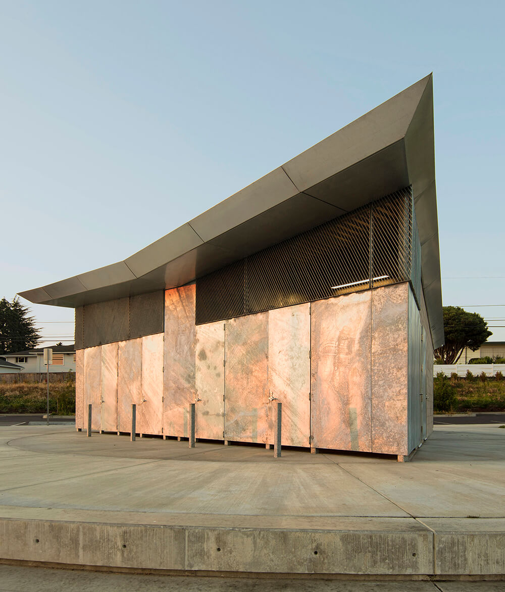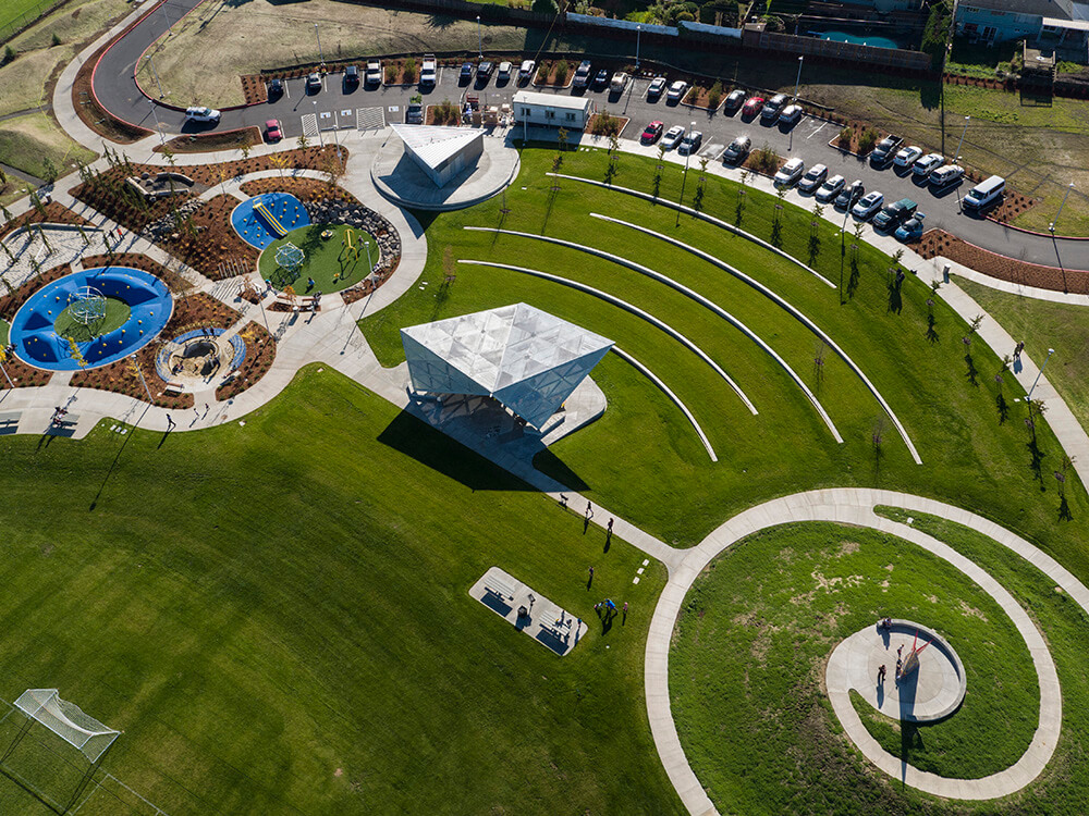 The signature element, a 1,760-square-foot multipurpose shelter, is made from a series of interconnected equilateral triangles of perforated and galvanized steel plate. The folded angular form takes its inspiration from the triangulated peaks of the surrounding mountains, Native American plank houses and river fishing platforms. A simple steel pipe frame supports the shelter to create a flexible space for picnic gatherings or summer concerts. By celebrating the structure’s tectonics and revealing the means of construction, the structure serves to honor the economy and beauty of native structures built by the original inhabitants of the area. Axial connections through the park enhance user awareness of the world beyond the park. Park program elements and trees are arranged to manipulate view corridors to Mt. Hood and Mount St. Helens and help to organize other site elements including a small steel-clad restroom building. At the highest point on the site a conical mound recalls the volcanic cinder cones on the horizon. Visual connections between key park elements articulate the experience along and across the axis.