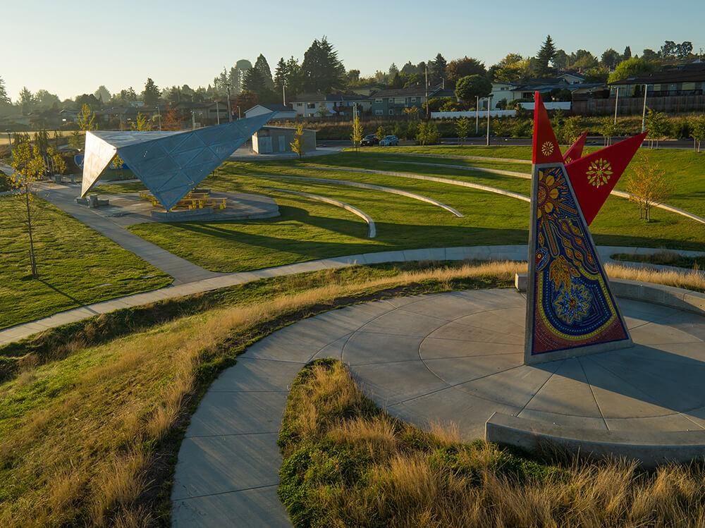 The park’s development introduces a mix of new activities onto the site including a community amphitheater, picnic shelter and restroom, off-leash dog area, a large community playground, interactive water feature, parking areas, walking paths, and community garden. Active uses include a skate spot, climbing wall, basketball, ping pong and soccer. The park’s design takes advantage of views to the Columbia River and distant Mount St. Helens while introducing a strong sense of the area’s native habitat to tie all of the elements of the park together.