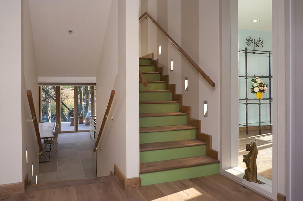 The two story building ‘floats’ above the ground on a semi basement and is accessed by a wide bridge from up the slope. It is visibly part of the hospital but lifted up protectively amongst the trees.