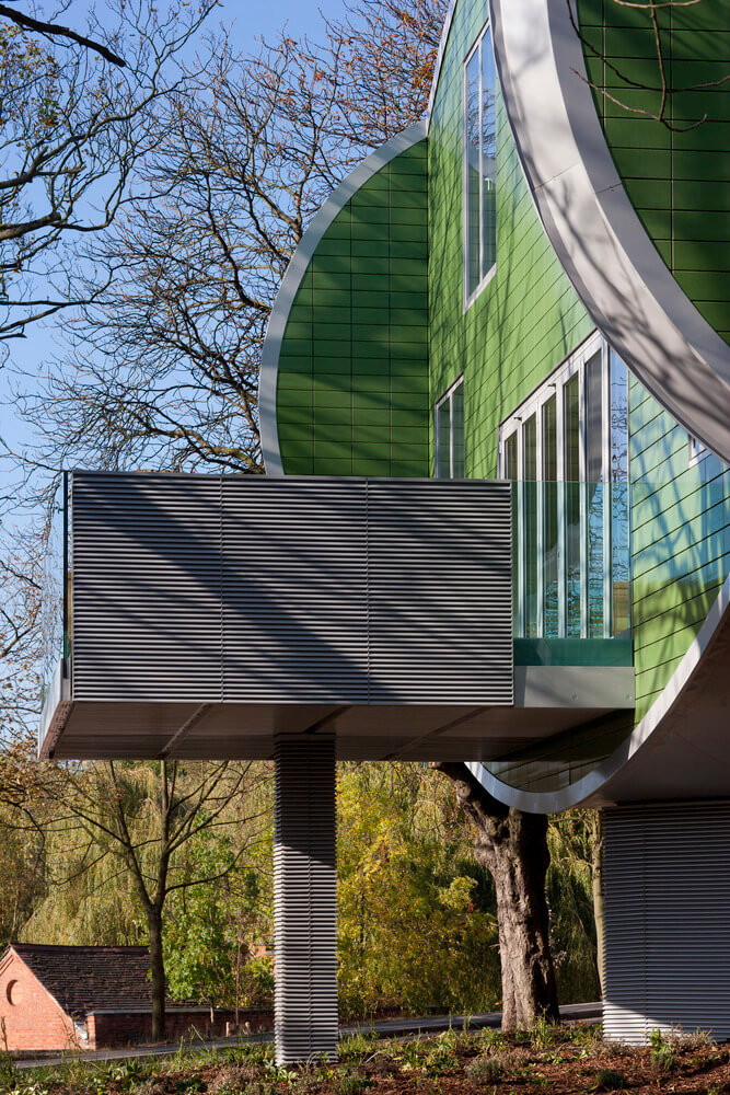 Economical square plans in which the large number of rooms required flow from one to another are fronted by the green glazed oval elevation with their overlapping corners. The section exploits the curved roof and at the same time soffits in order to provide different height rooms and spaces. They rooms are furnished in a rich way to the design of Sir Paul Smith, a famous son of Nottingham. The rooms are extended by large balconies out within touching distance of the tree canopies.