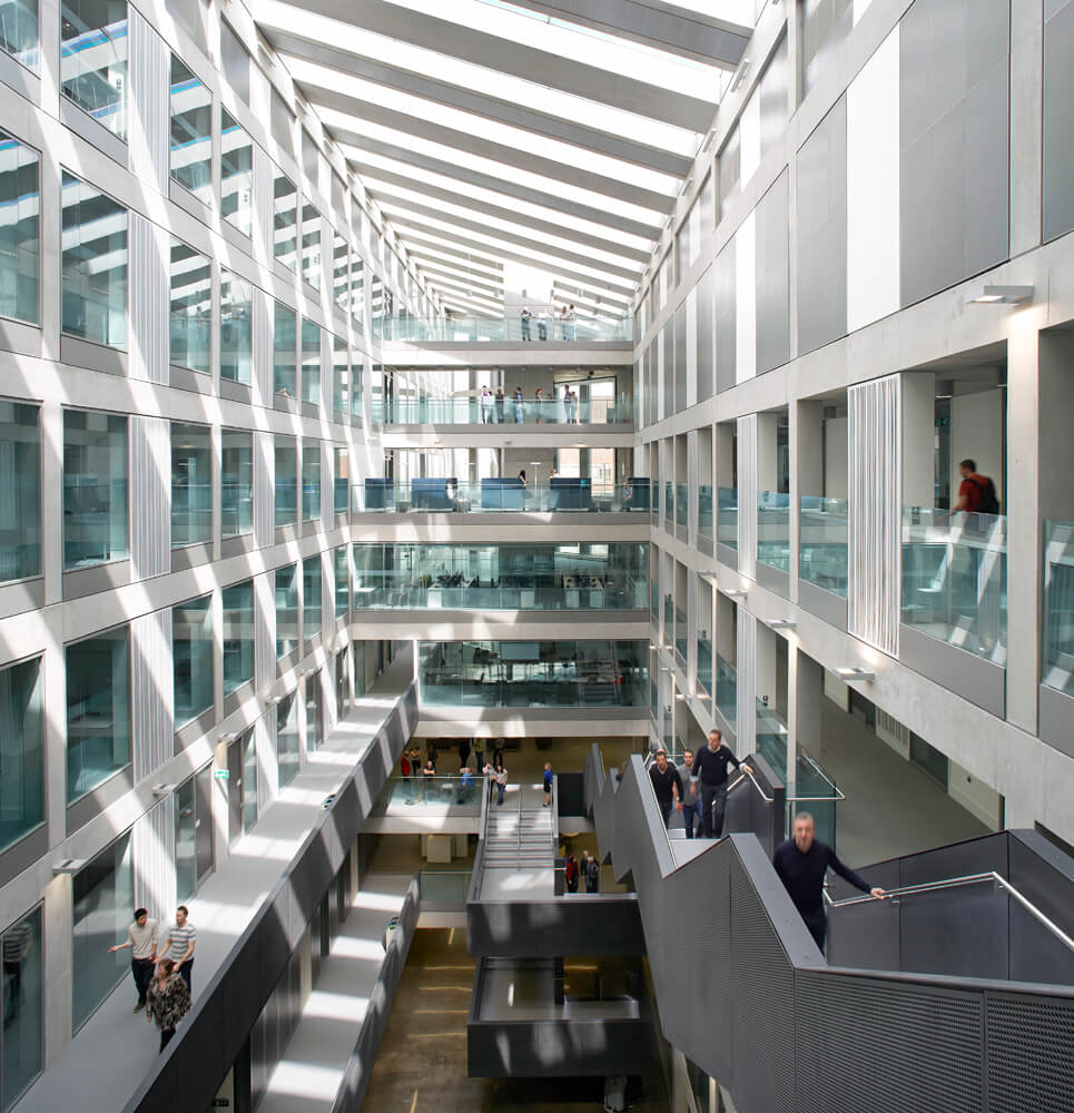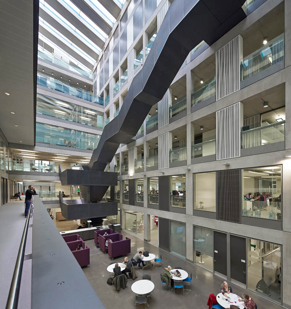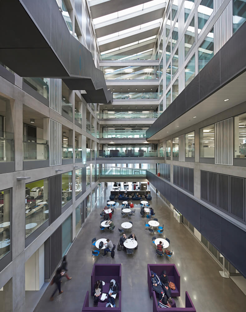 Inside, three simple parallel 12-metre wide ‘flexible’ floor plates are spaced 12 metres apart, creating two bright, enclosed atria. The taller is occupied by the Business School, the smaller by The Hub. A series of formal and informal ‘social learning spaces’ permeate the building on all levels.