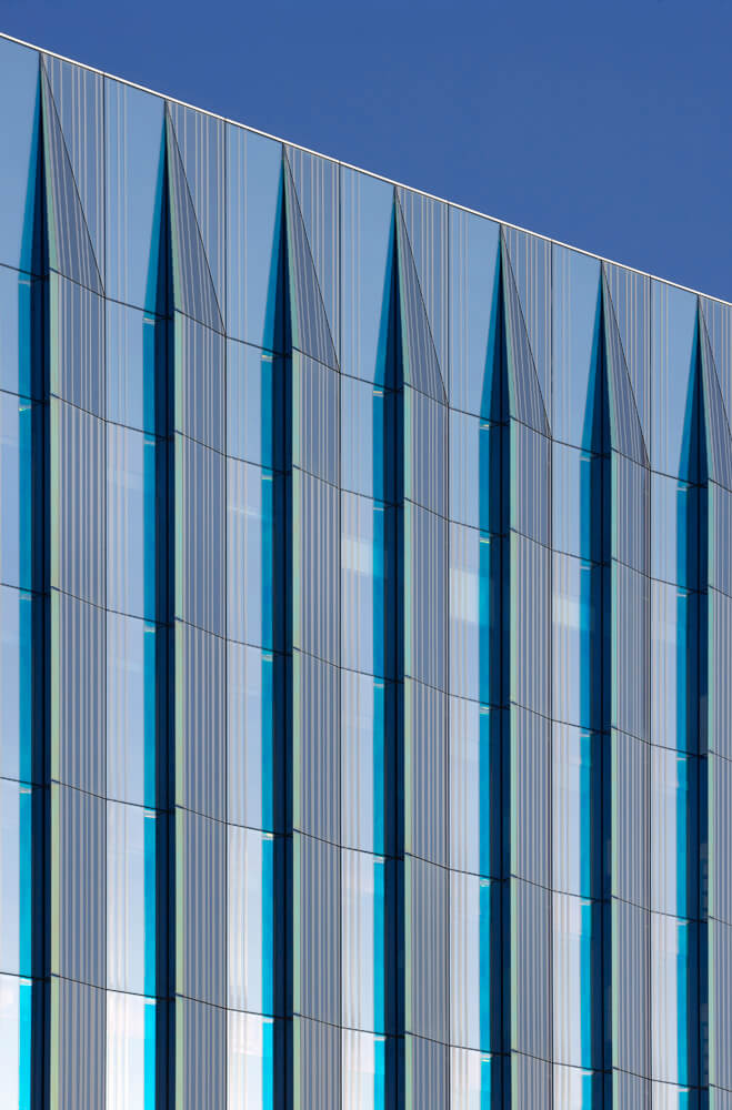 Collaborating with the artist, Martin Richman, we conceived the building as a jewel-like crystalline object in contrast with the University’s existing red brick buildings. Pleating the façade with light refracting and reflecting dichroic fins animates the structure, its reflections changing with time and seasons.