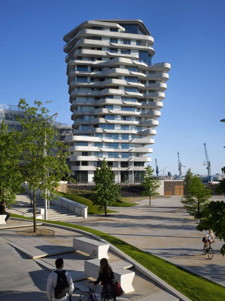 The Marco Polo Tower sits on the Elbe, on a prominent position in the HafenCity, right beside the Unilever headquarters, also by Behnisch Architekten. The end of the route from the inner city out to the new attractions, the Cruise Ship Terminal and the Promenade on Strandkai are punctuated by this 55m high tower. This building adds to Hamburg’s silhouette, having a form form and arrangement that makes it unique and remarkable. All 58 apartments offer spectacular views over the harbour and the city, organized in 17 above ground levels, each turned a few degrees on their axis.