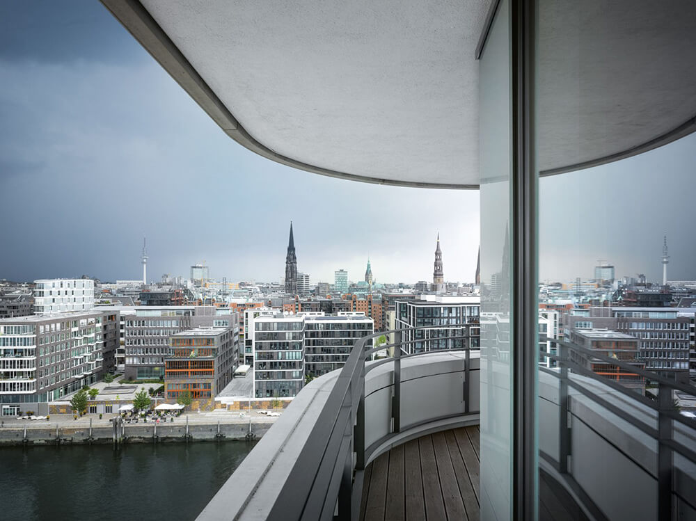 Apartments cover an area of 60 and 340 square metres. The living areas are extended by generous perimeter terraces and balconies out into a soft play of lines, and lend the tower its distinctive image. The possibility of increasing areas by connecting neighbouring apartments offers a high degree of flexibility. The interiors have external variations in appearance, so none of the levels or apartments look like. Residents can choose to live between two room apartments and large penthouses with maisonette characteristics. The design reduces as much as possible load-bearing structural elements and necessary fixed services. This way the residents themselves can decide where they want to sleep, cook, eat, bathe or relax. On entering the apartment one has An uninterrupted view over an open plan living room landscape is what each apartment displays on entering, through generously sized glass panels, to the outside world and Hamburg’s roofscape.
