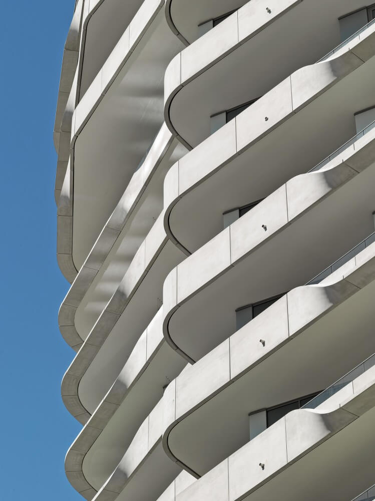 High-class living accommodation and a holistic ecological building concept are brought together in this tower. The overhanging terraces above are protecting the recessed façades from direct sun so that additional sunshades are not necessary. Heat turns into a cooling system for the apartments with vacuum collectors on the roof, using a heat exchanger. Innovative sound insulated air louvres in the sleeping areas make natural ventilation possible without increased noise pollution from outside.