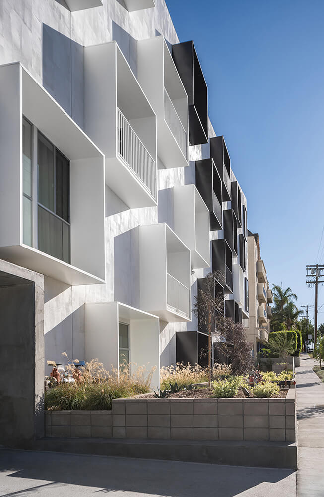 The white skin, reinforcing the purity of the structure’s form, is broken by a rhythm of select black treatment to the protruding boxes. Throughout the day, the movement of dark shadows across the white and black facades activates the project with a dynamic sense of constant rearrangement.