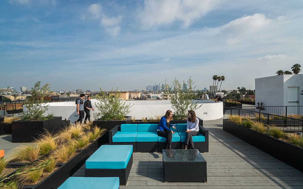 Internally, LOHA’s carved opening creates a central focal point for the building’s interior organization and lets natural light into the courtyard. The courtyard ribbon draws the eye upwards and creates continuity from floor to floor. Below the opening, a landscaped planter with integrated bench seating doubles as a rainwater collection system. All units have exterior access and can be cooled by holistic and sustainable methods of cross ventilation. A rooftop deck provides additional outdoor space and skyline views.