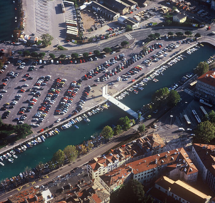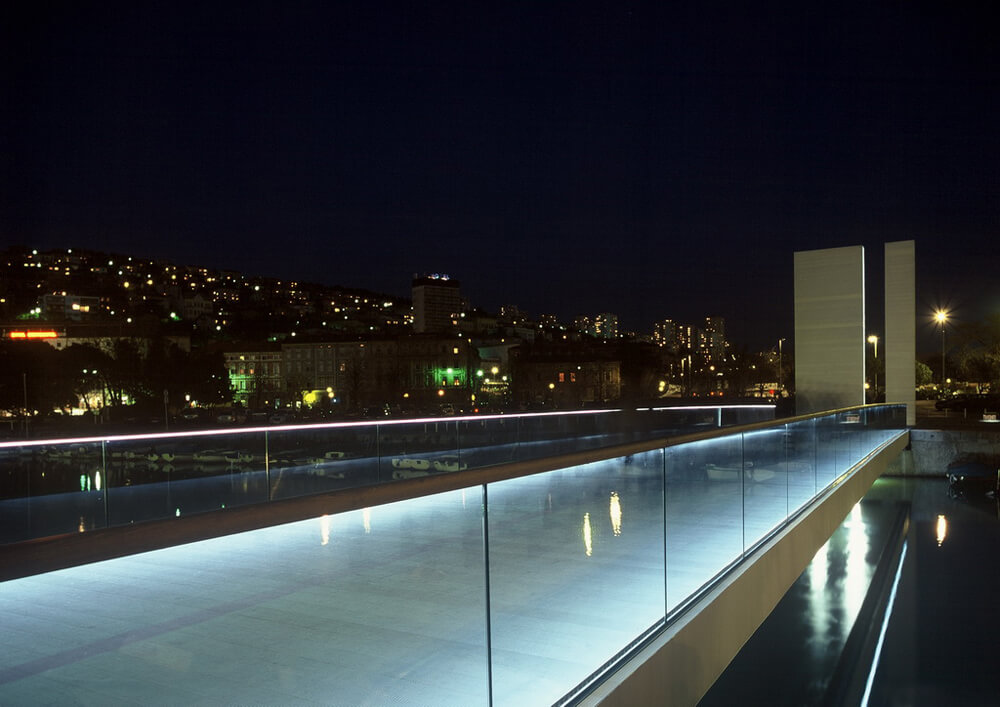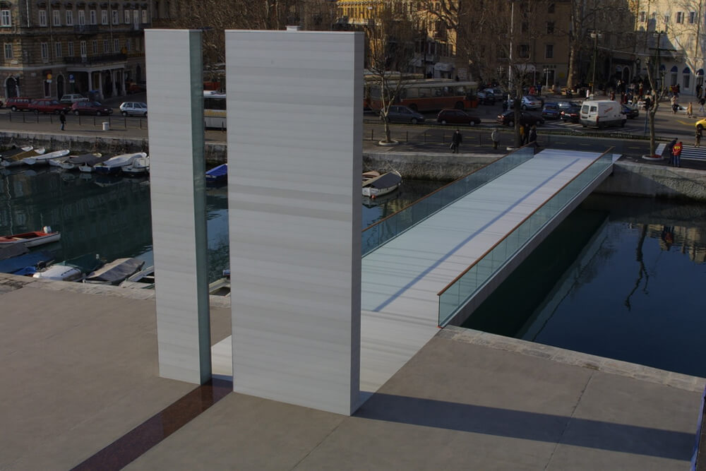 The Memorial Bridge is a spatial intervention and an urban public object, a construction with tactile properties and a symbolic object. It is a pedestrian bridge that embodies the utilitarian function and a memory of the Croatian war of Independence veterans, a place of memory and piety, but also a social gathering and socializing spot. It is located in the center of Rijeka, on the channel which separates the historic city center from the former port, at one of the most potent sites for future construction (it is currently occupied by a parking lot, in the future it will become a park).