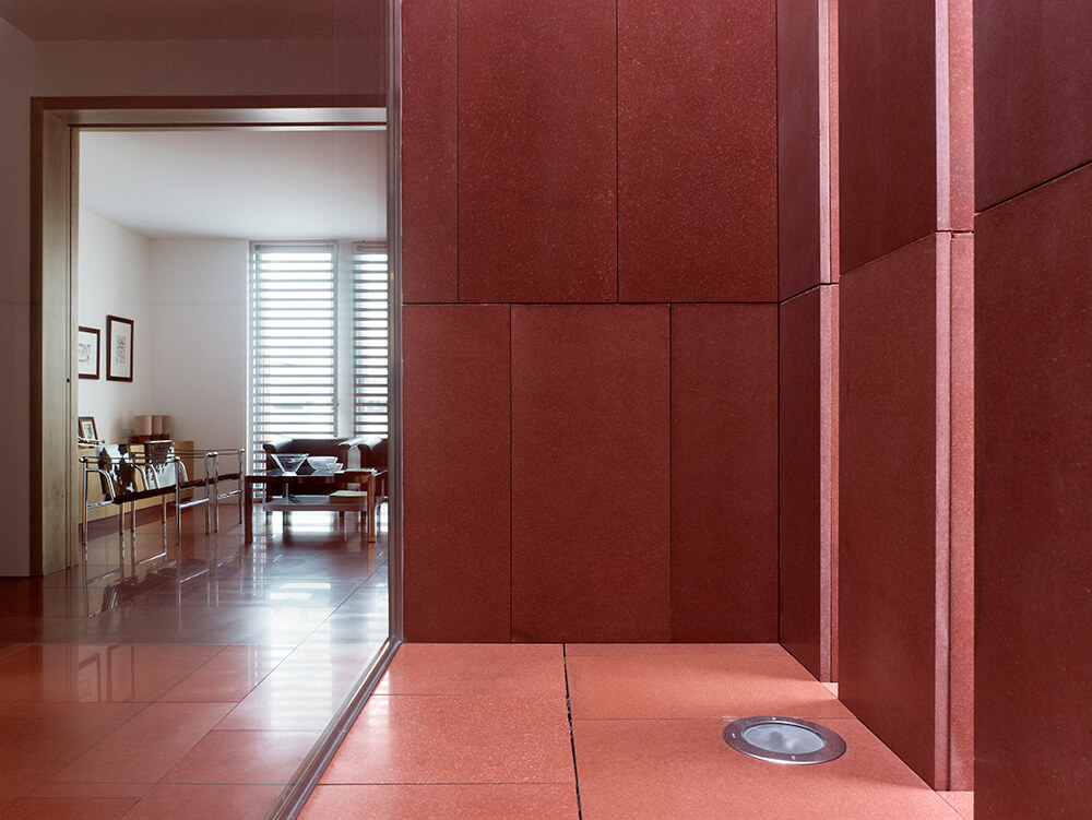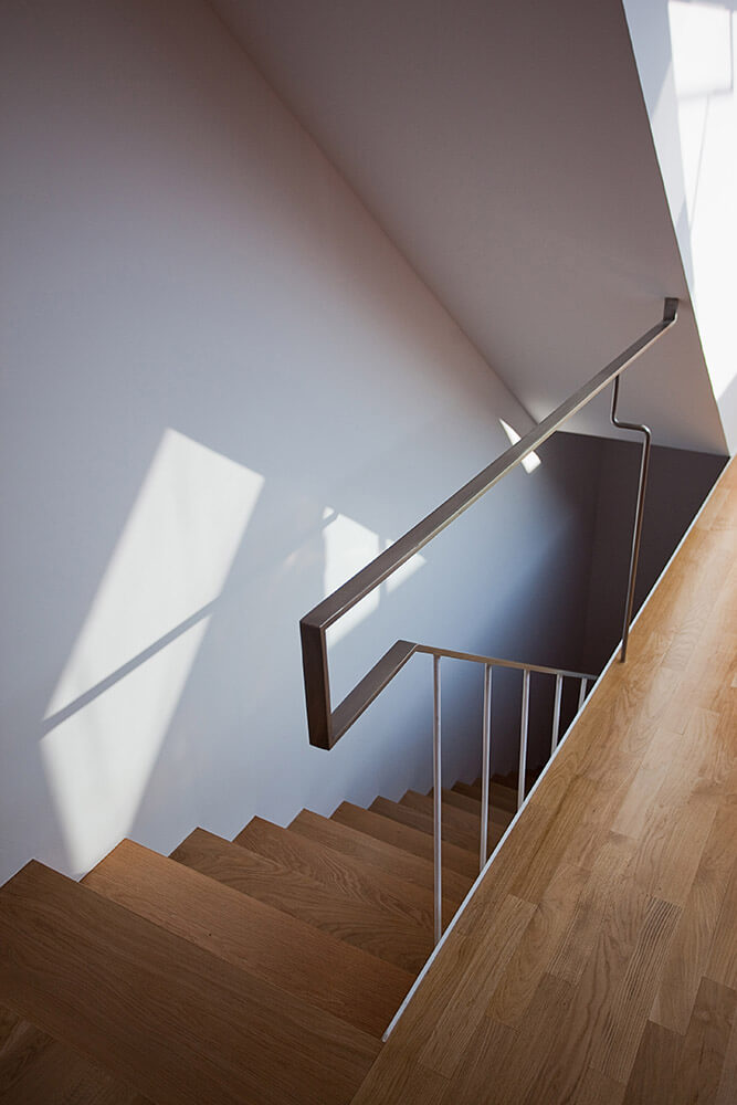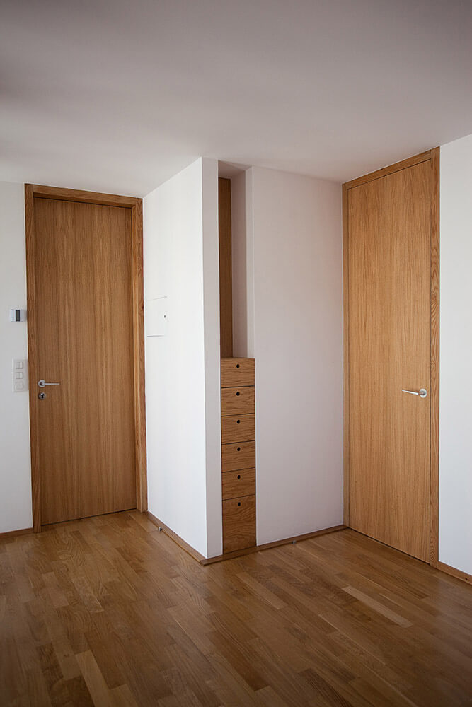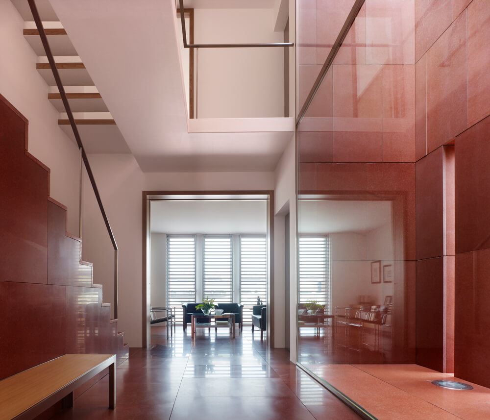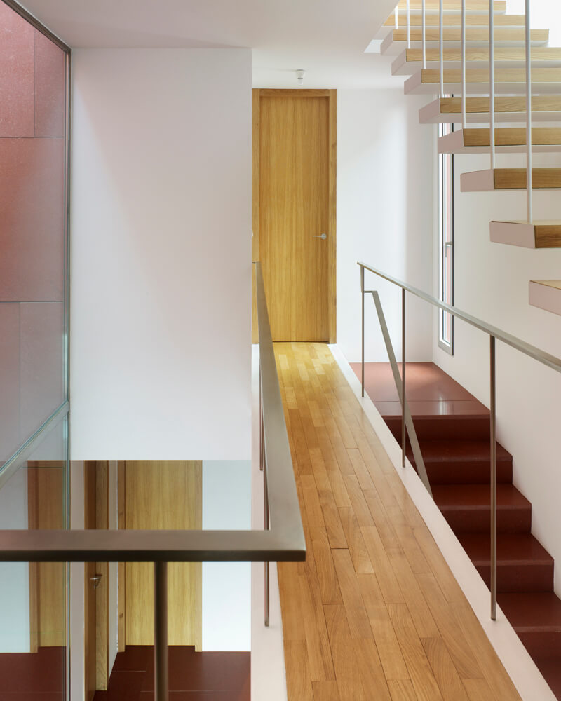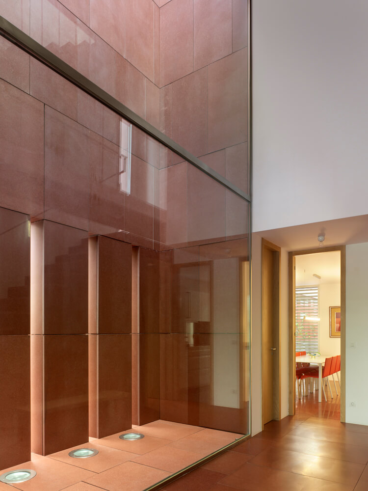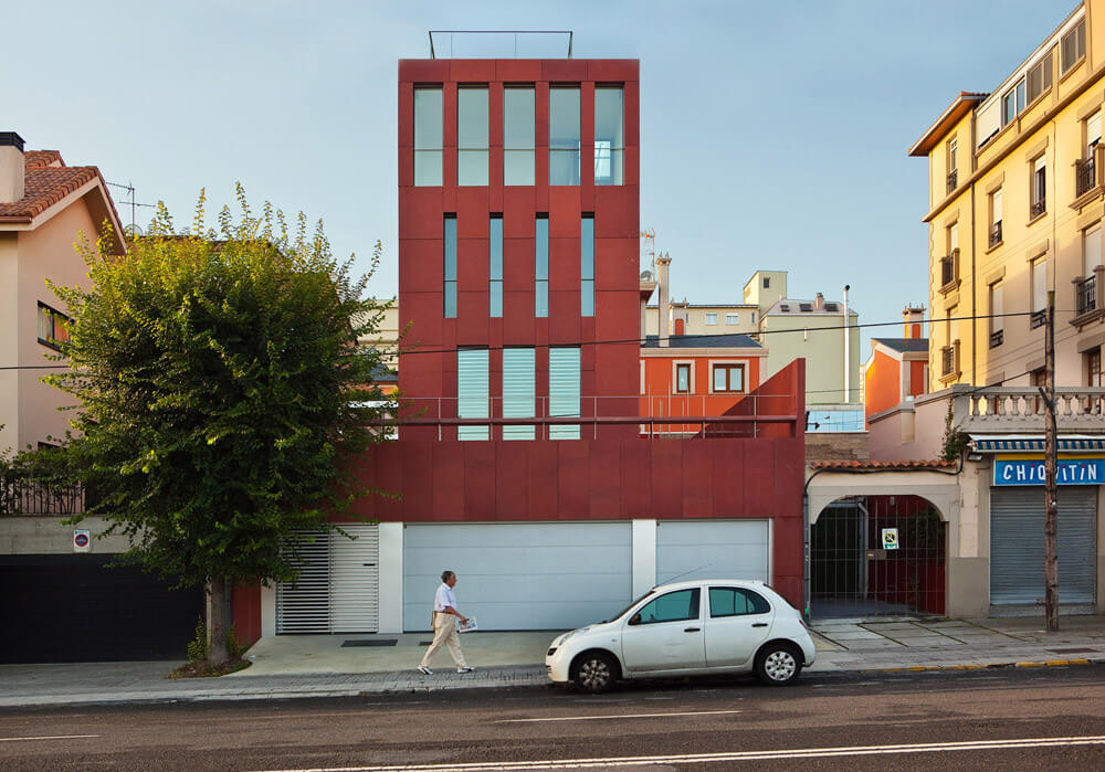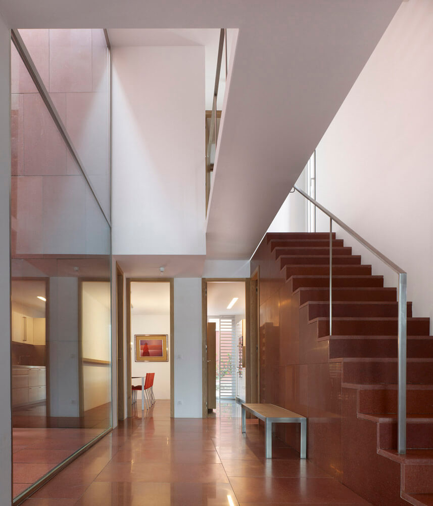 The plot, like all those of the same alignment, has the particularity of being limited at the back by another much higher level which situates the dwellings on the base of a high floor through which the access occurs. With its front facing north, the solution of the housing is also conditioned by the two lateral setbacks that fix the plan and by the minimum width dimensions of the plot. The interior layout is organized into two areas that occupy the northern and southern extremities of the construction; between them appear the elements of communication and a patio facing the interior space through large panes of glass.