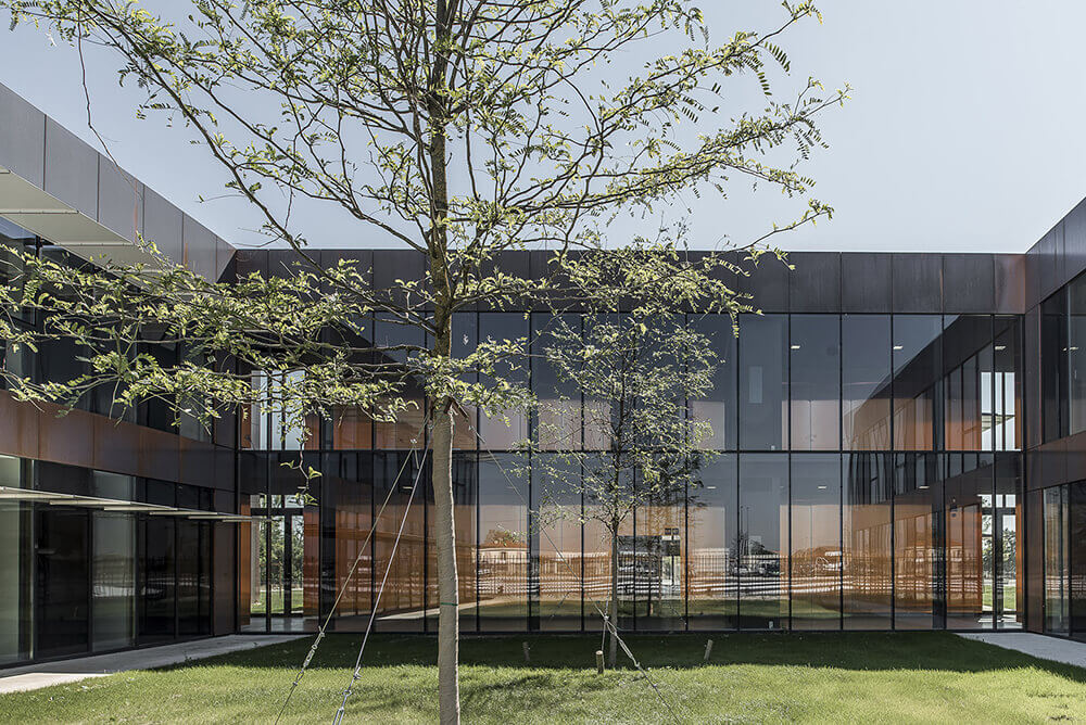 The inner orange copper hue of the common spaces contrasts with the outside brown tone to create a smooth transition with the land.