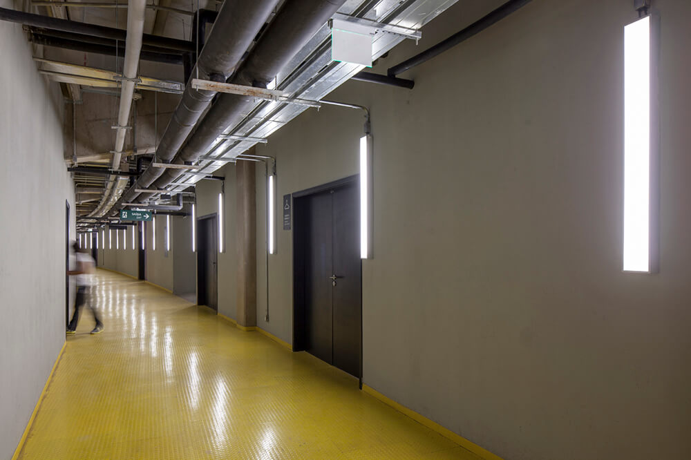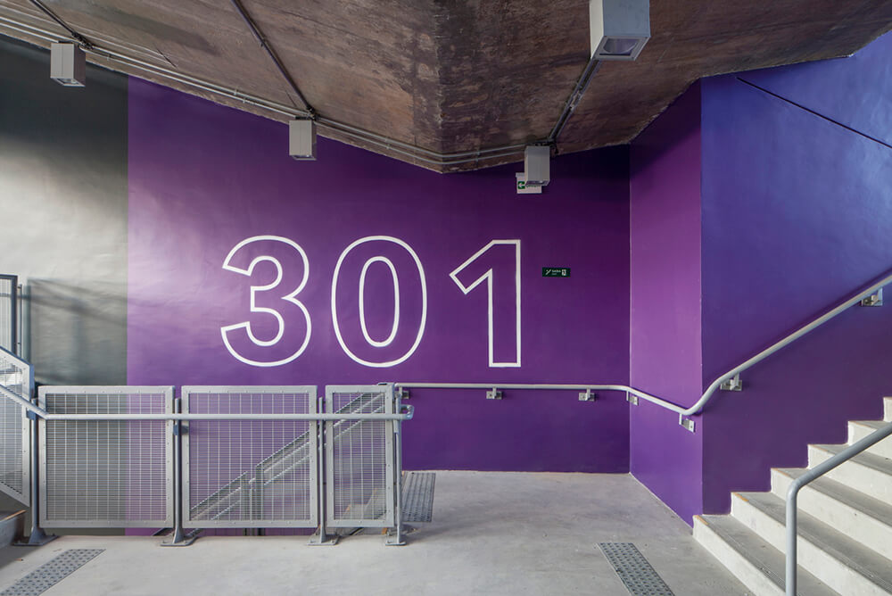 This artificial topography is thus intended for the flow of pedestrians – and crowds. Meanwhile, floors underneath host an intricate network of flows and operational areas, alongside purposes demanded by the PPP model (commercial and institutional areas) and the government (Football Museum, health center, small claims court). Therefore, the front of house, set above, is separated from the back of house, below, through a vertical sectorization (cross-section), associated with the traditional horizontal one (plan).