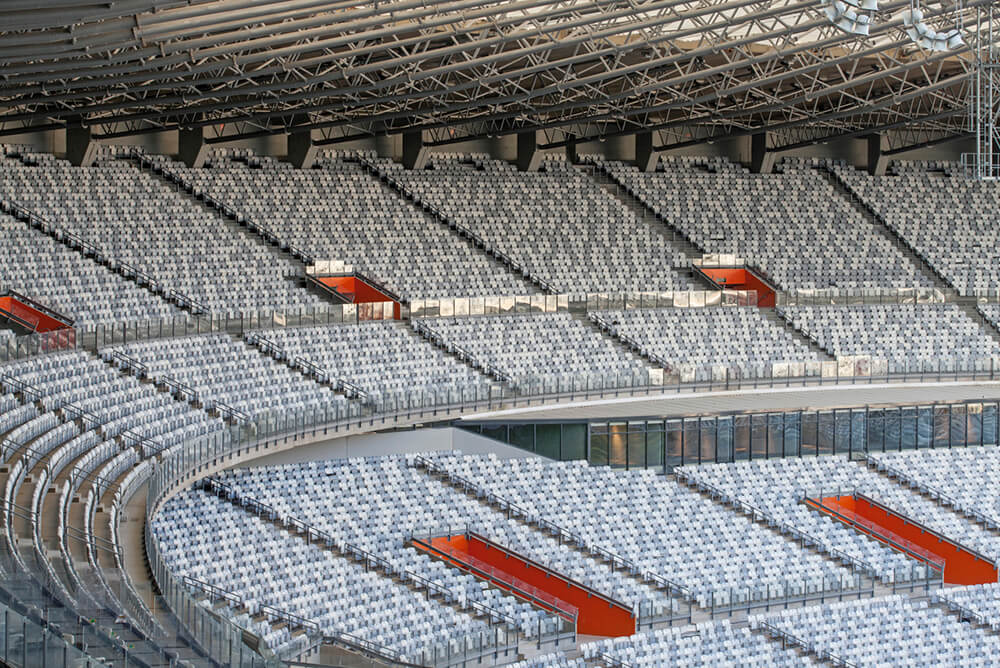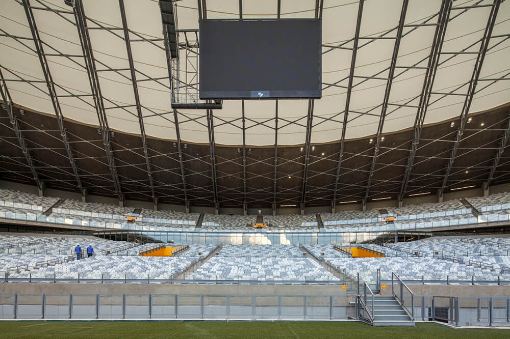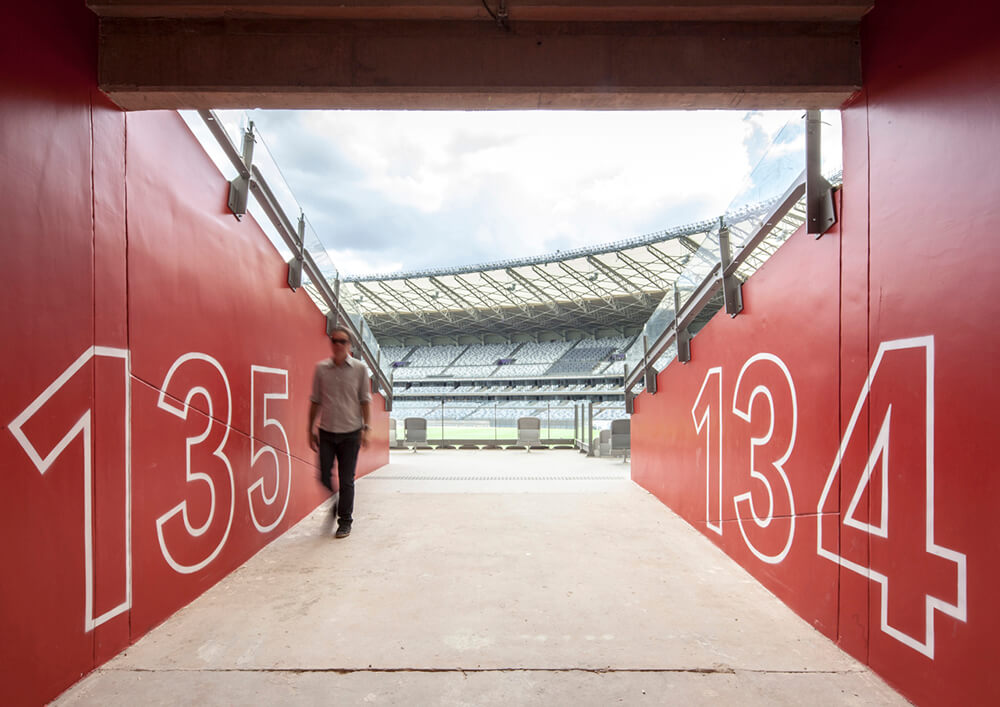 Of the existing arena, structural frames, roof slab and upper tiers, all protected, were kept. Intermediate and lower tiers were demolished and the pitch was lowered by 3.40m, achieving FIFA´s sightline requirements. The stadium was furnished with 62.160 sturdy ergonomic new seats, colored in three shades of gray that generate an unusual pixilated effect, creating a neutral background for the vibrant colors visual communication project, signed by Hardy Design.