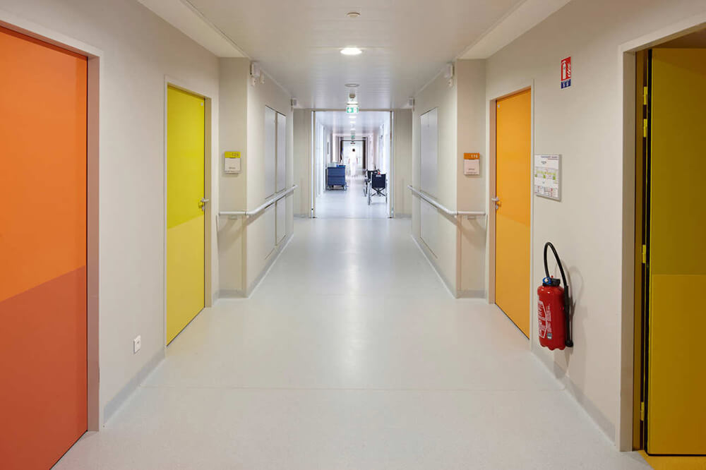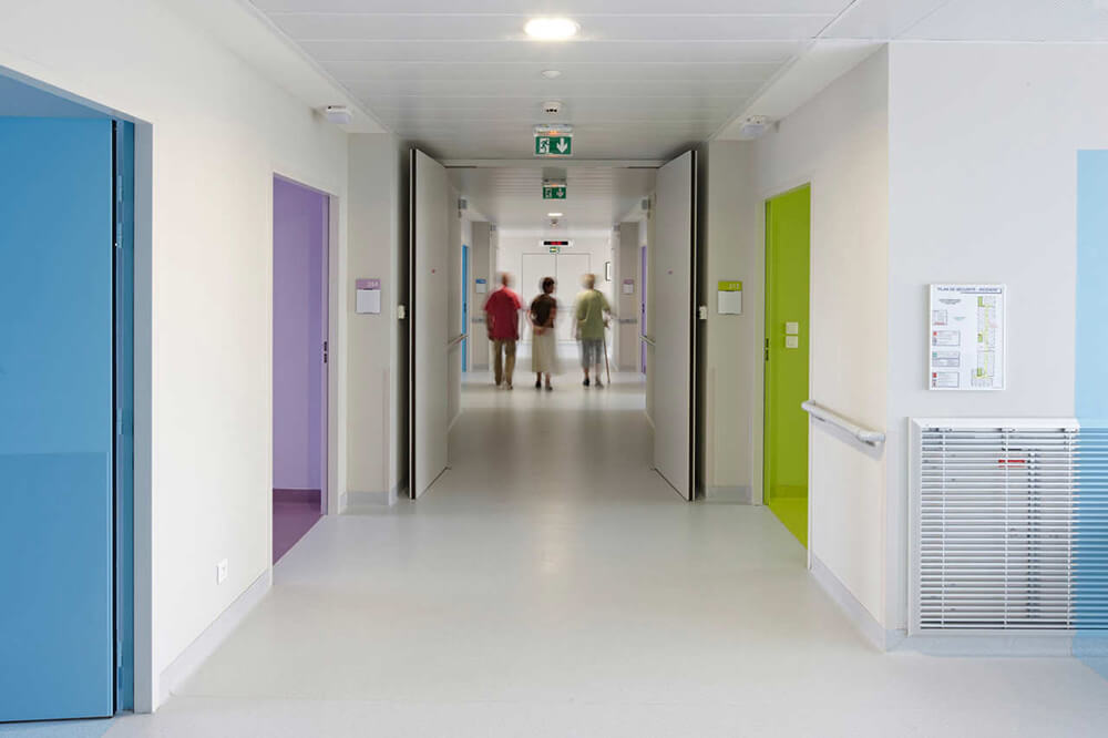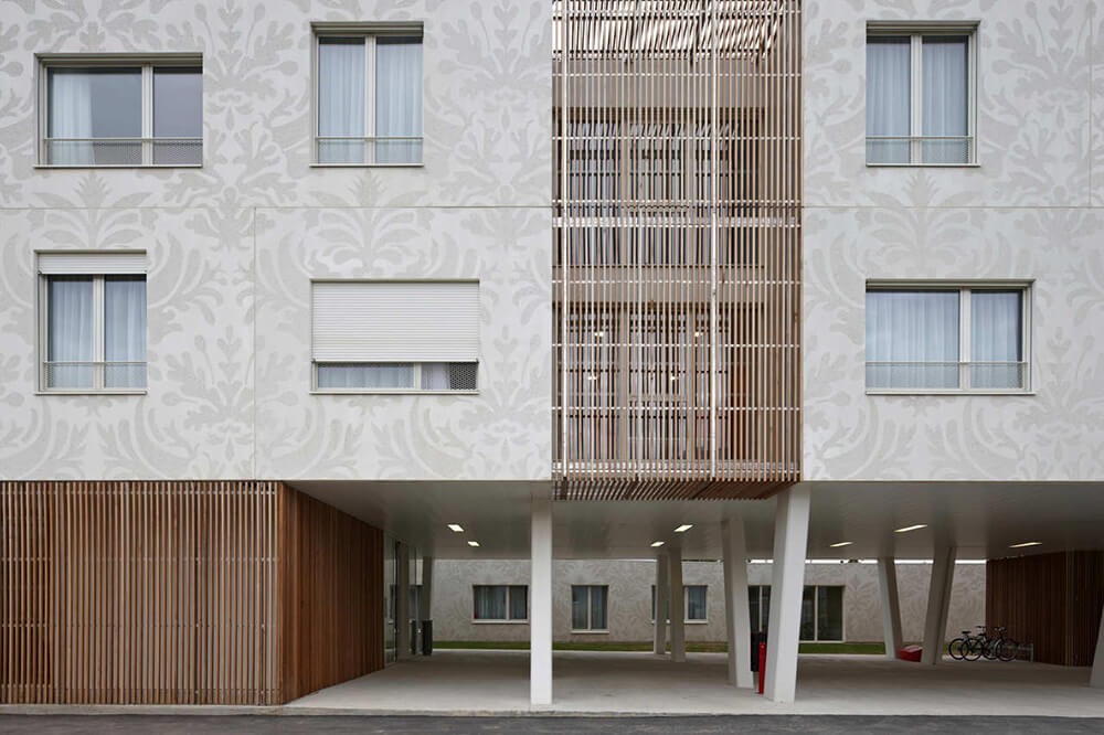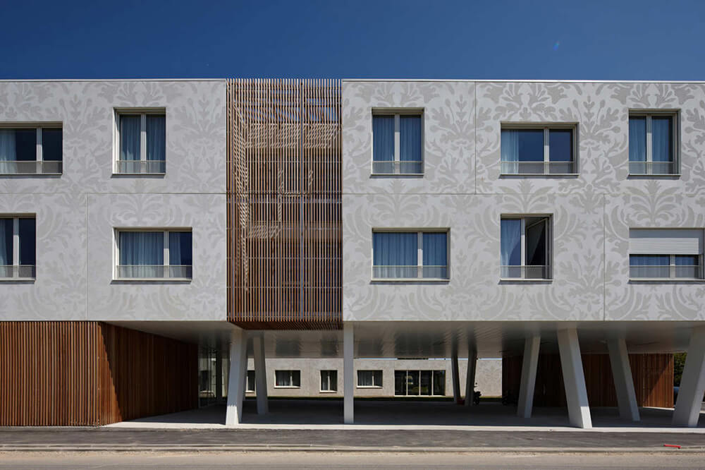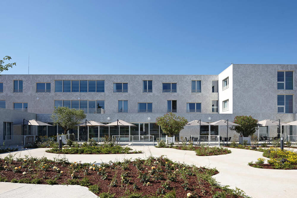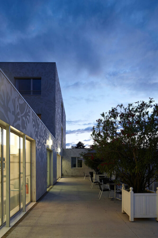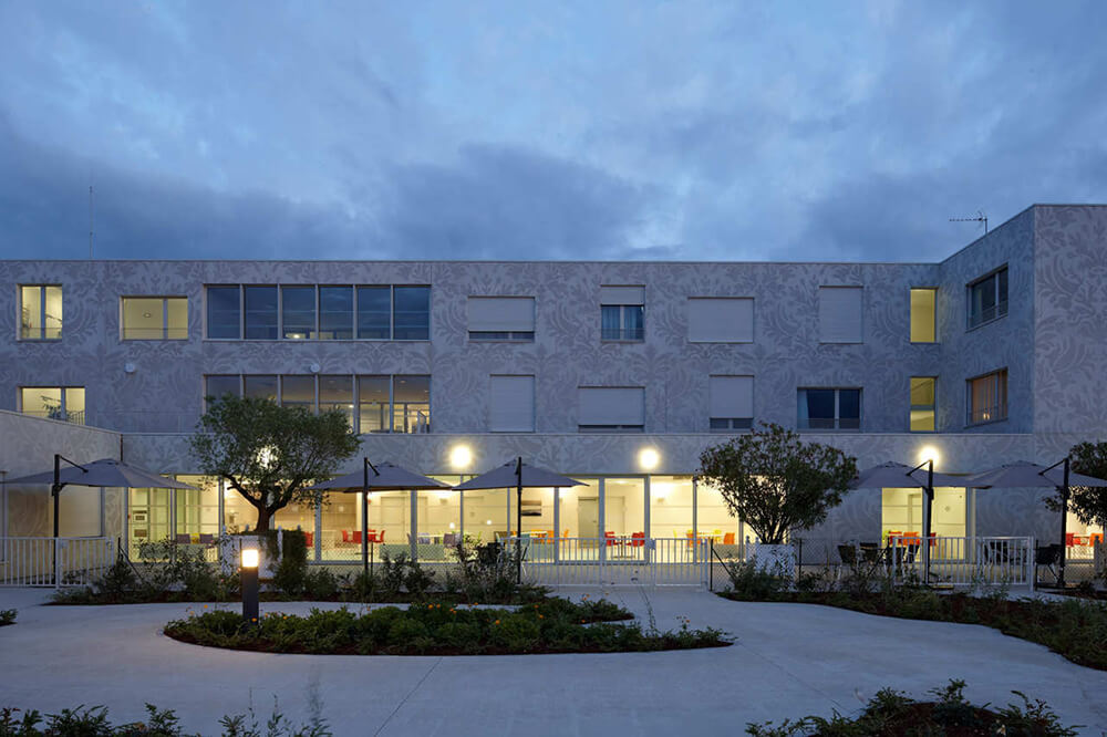 On the ground floor overlooking the street secondary premises can be found. The rooms on all upstairs floors are protected by a set back (Alzheimer unit). All the communal living spaces are placed facing the large internal garden. The corridors leading to the rooms are deliberately well ventilated, becoming naturally lit lanes every four or five rooms, and in the end compose a veritable avenue, where events take place within the generous amounts of natural light, and where there are comfortable views of the garden. Each view toward the outside creating a small lounge conducive for meetings.