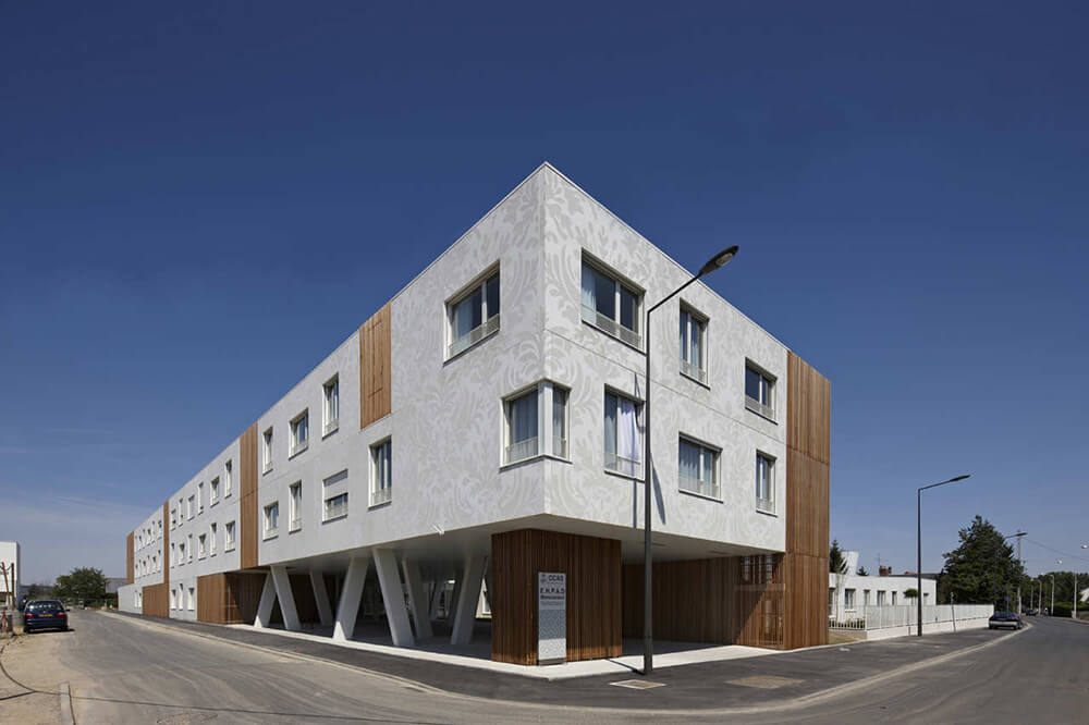 To try and reconcile these demands with the ZAC regulations the area was subject to, we proposed a compromise. The result of which is a building in the shape of a “U”, composed of three parts. Its main body, made up of three floors, extends out to the alignments required at the southern and eastern boundaries. Its upstairs floors contain the two units for traditional accommodation, while its ground floor contains communal living areas. It is partially built upon stilts, at the corner of two streets, so as to free up, on the ground floor, an entrance area for the public. The second body of the building, made up of a ground floor only, extends to the western boundary, where alignment was also required. It houses all the technical premises, along with the central kitchen, and is extended by a service courtyard. A third and last body, less restricted by requirements of alignment, unfolds in a single, ground floor to house the Alzheimer units, and contains secure gardens, being set back in relation to the street.