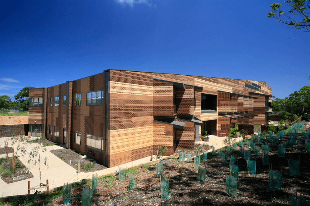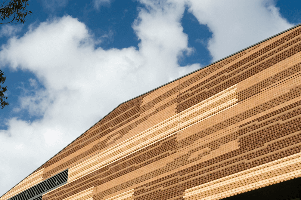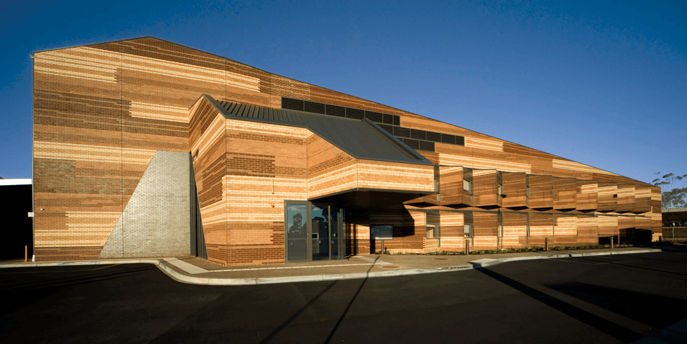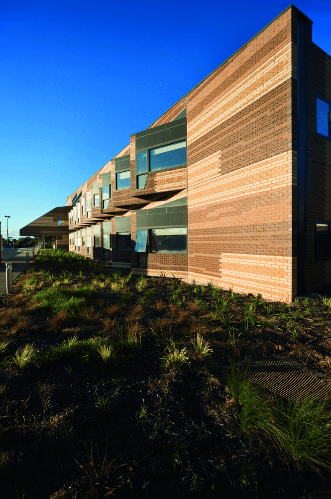 The conventional paradigm of a hospital is contested by this extended care facility. The whole building is encompassed by its large pitched roof and brings together the interior spaces. The building appears ‘timber-like’ – clad in oversized planks which are rendered in digitally embossed bricks giving the building a homelike quality.