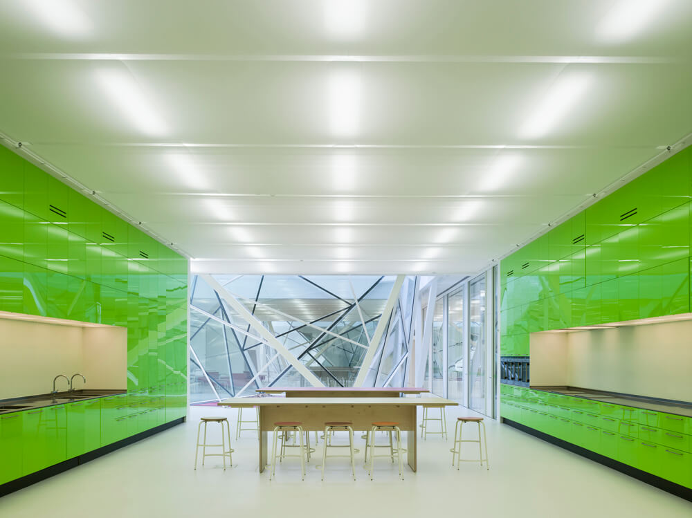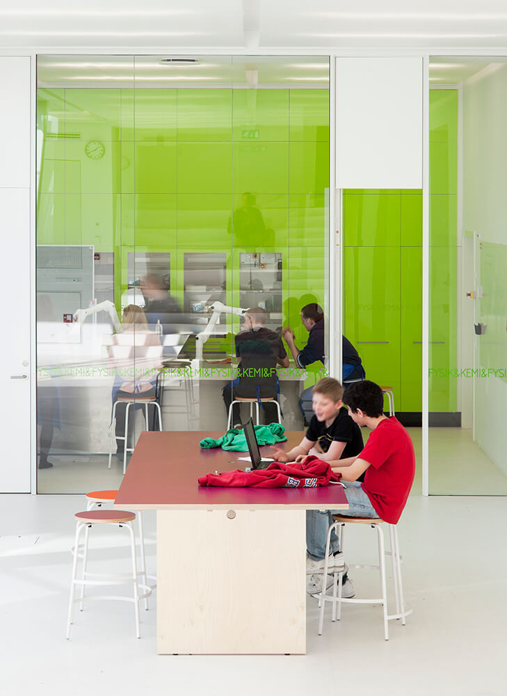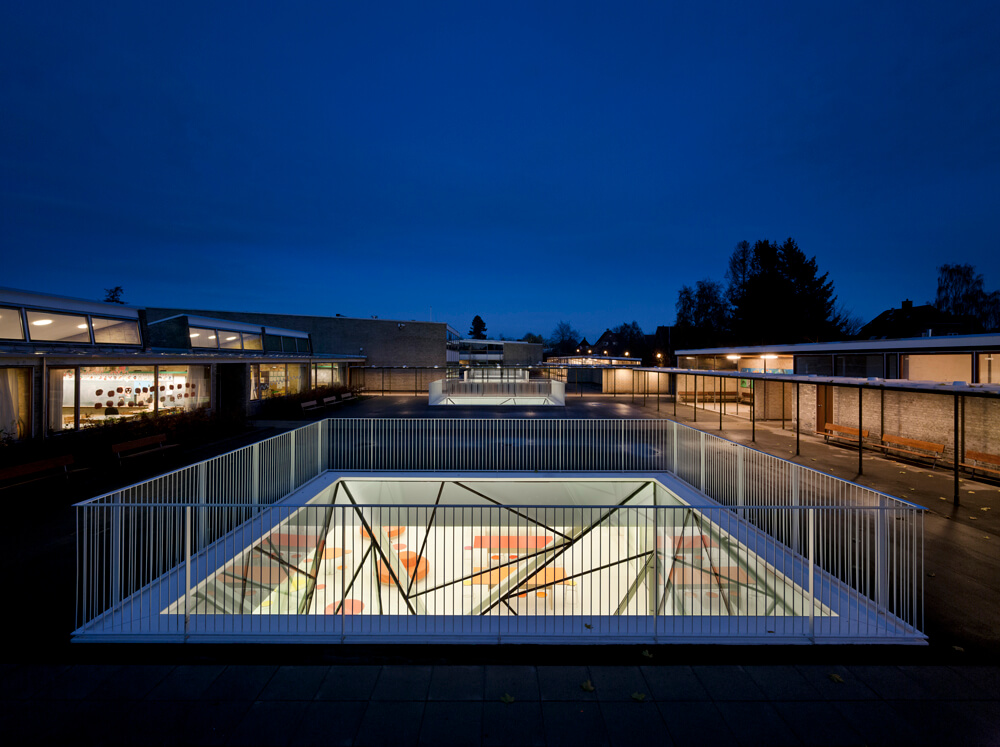 In 2005 the school, with its physical environment was not accommodating the school’s desire to implement interdisciplinary teaching and the ability to differentiate instruction according to Danish modern teaching principles. This was remedied by the extension of the school in the new facilities beneath ground. The extension was built for special subjects as “cooking”, “body and health”, “nature and technology” and Physics and chemistry. All specialized spaces are connected with a large common area, that again connects to the rest of the school. The large space allows for experimental courses, and is also used by the pupils for group work.
