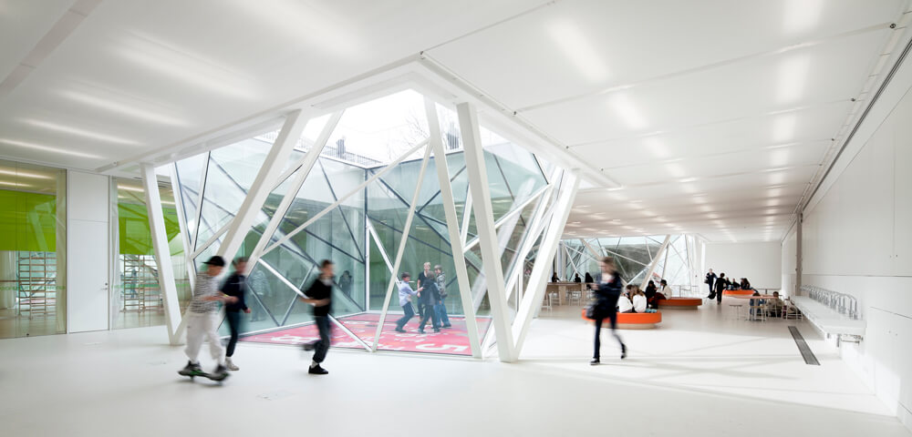 To change the former assembly hall into a library and assembly hall, a mega stair construction was implied. the construction is used as bookshelves in daily use, but can be changed to house audience for special occasions. The steel construction is clad in load bearing cellular polycarbonate to allow daylight. bookshelves is also used as small hideouts, and has a Harry Potter like world of turning bookshelves that allows the individual person to create his own space.