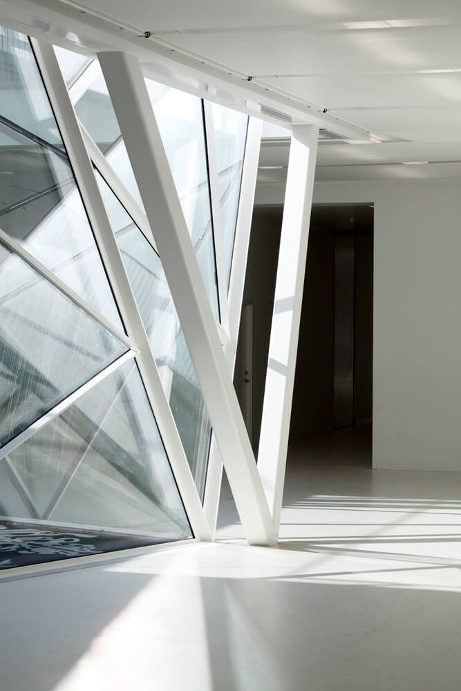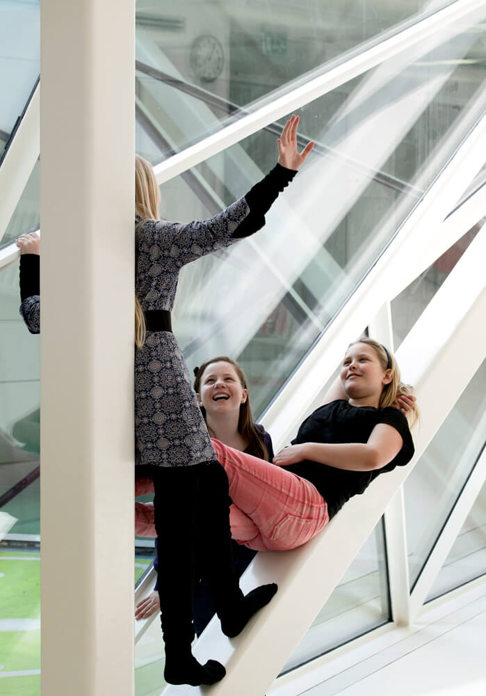 The original school consists of a repeated structure of building and courtyards. The design of the new underground extension used this theme, establishing daylight in the parterre plan via 4 large courtyards, designed as crystal-like openings. The proportions are half of the original court yards and appear rectangular and well defined from the playground, but twist under ground to a foot print rotated 90 degrees. The rotation of the four court yards makes a more organic, and open flow in the parterre plan. The court yards are used as outdoor space in connection with the projects that take place in the common space.