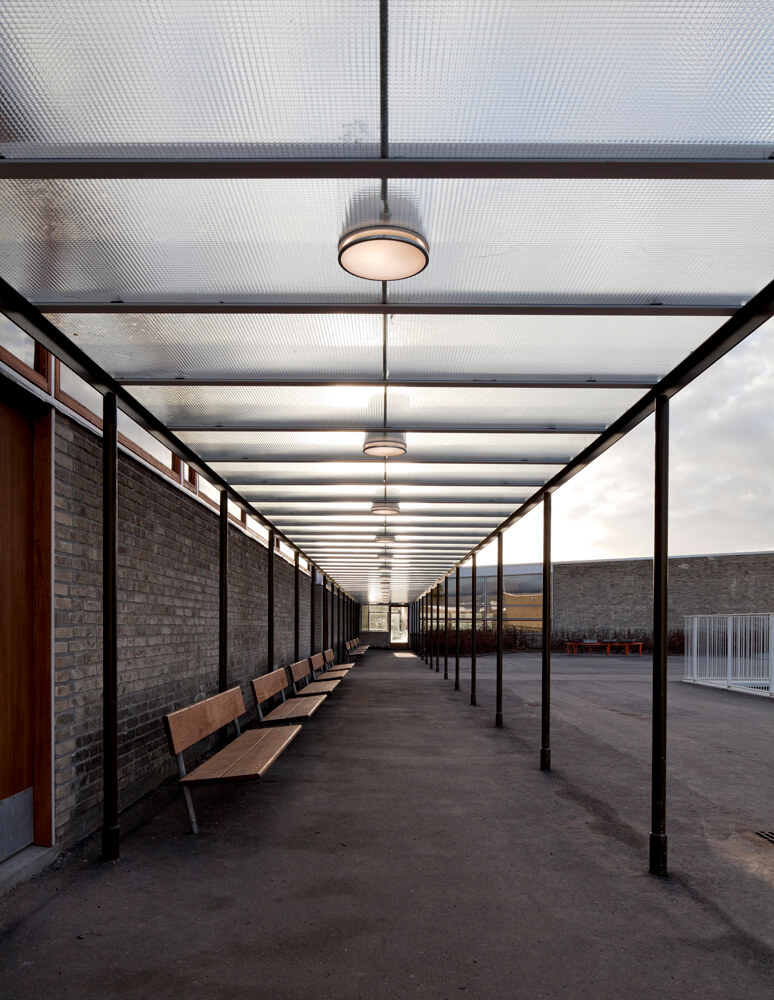 The 5500m2 existing buildings were designed by Arne Jacobsen and built 1954-1956. When built the school was very modern having well lit bright classrooms with direct connections to private green court yards – all on ground floor. Arne Jacobsen designed, furniture, fixtures and did the landscaping as well. It is appointed to be one of Arne Jacobsen’s masterpieces. Munkegård School was listed in 1995. Today the school appears almost as originally, but in 2005 it showed signs of wear over the years. The restoration included both preserving interventions and renovation according to Arne Jacobsen’s old detail drawings to bring back some missing details.
