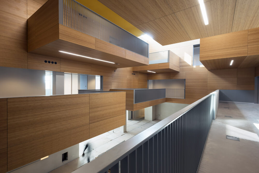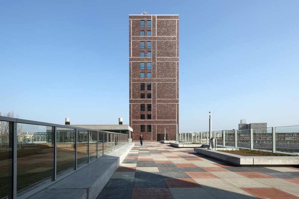 In the large complex the functions are cleverly connected so that in the future the rooms can be used in various ways. One of the schools is located around a large atrium that serves as an auditorium and a meeting place for students, teachers and other users. Both schools share the sports hall which also has a public entrance so it can be rented out in the evenings. On the roof between the two higher towers a large, green square is built where students can have their break and residents can sit outside. The ground floor is a lively plinth; the entrances of the schools, sports hall, apartments and other functions are located around the building.