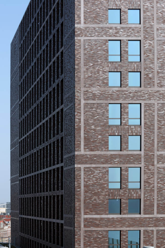 Musa was to become a friendly and appealing residential and education building, but it also had to fit in with the large construction volumes. diederendirrix has designed a complex of large construction volumes that, with its robust façades in dark brick and concrete, refers to the old warehouses and the original harbour architecture. Taking a closer look, the refined details, materials and rhythms that give the façades the effect of a residential building, are visible. The bricks in the façades sparkle and light up in daylight. Strips of bricks, wedged in between concrete frames, run across the bold façades like a subtle plaiting.