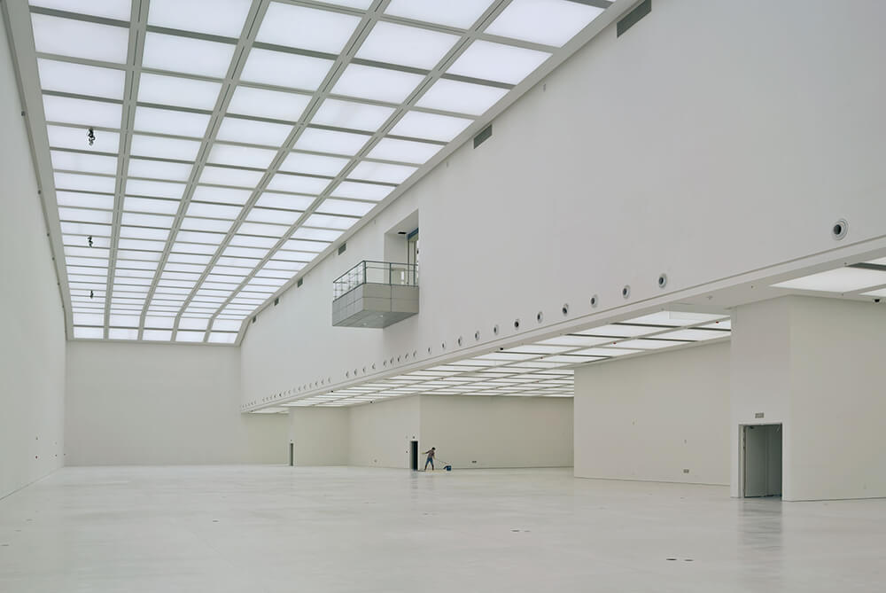 Both museums are designed as separate entities emphasizing their individual functional and artistic requirements and yet are merged in a monolithic body surrounded by a versatile facade. The lobby, multifunctional exhibition halls, auditorium, conference rooms, and service areas will be used jointly. The transparent facade and a sophisticated internal lighting concept allow a deep view into the entrance and the transitional areas between the buildings. From the inside, visitors are granted an unhindered view to the city, suggesting they are in a gently shaded outdoor area, an impression enhanced by the 6 to 17 meters high, completely open and column-free, exhibition areas. Beyond the entrance area located between the museums, visitors ascend to the main level by means of ramps and escalators, and enter the Plaza, which serves as a point of departure for the guided tours. A silvery shining and softly deformed “Cloud” serves as a central orientation and access point. The “Cloud” hosts a number of public functions on several floors, such as a café, a bookstore and a museum store.